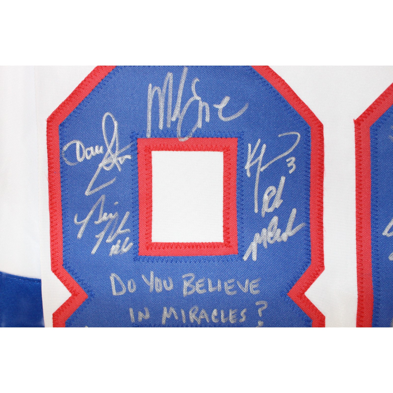 The number in the listing title is just an inventory sku for our records and is not the authentication number. The item pictured is a stock photo. There are multiple quanities of this item. Each of these items is unique because they are individually hand-signed. While the photographs accurately represent the item itself, please note that the signature’s size, exact placement, and strength may differ on the one you receive. This is a Pro Style White size XL Hockey Jersey that was personally autographed by Neal Broten, Dave Silk, Rob McClanahan & Mark Johnson, Steve Janaszak, Bill Baker, Dave Christian, Ken Morrow, Jack O’Callahan, Mike Ramsey, Steve Christoff, Mike Eruzione, Buzz Schneider, Eric Stroebel, Phil Verchota, Mark Wells, Craig Patrick, John Harrington & Jim Craig includes “Do you Believe in Miracles” inscription. Includes a certificate of authenticity from Beckett Authentication Services (BAS) and Denver Autographs (DEN). FREE SHIPPING within the USA on orders over $10!