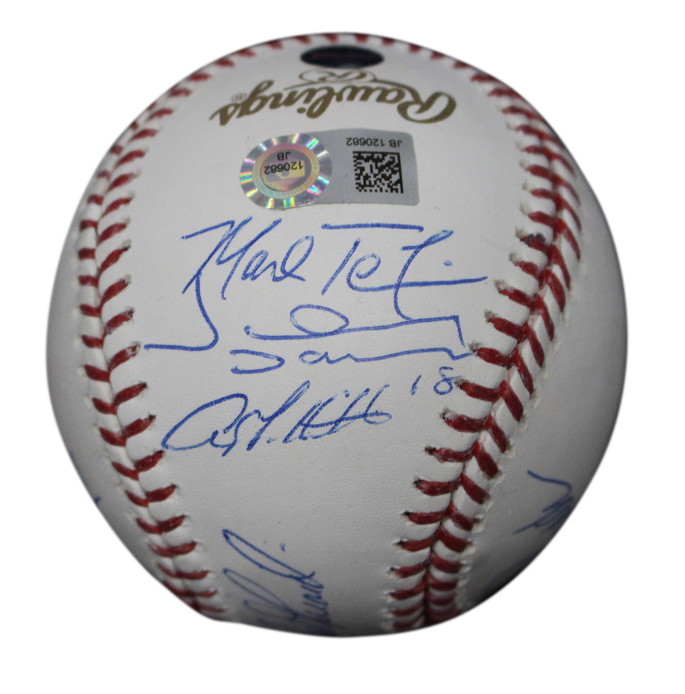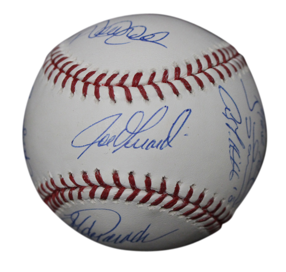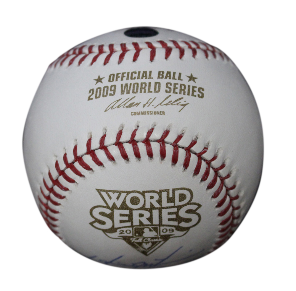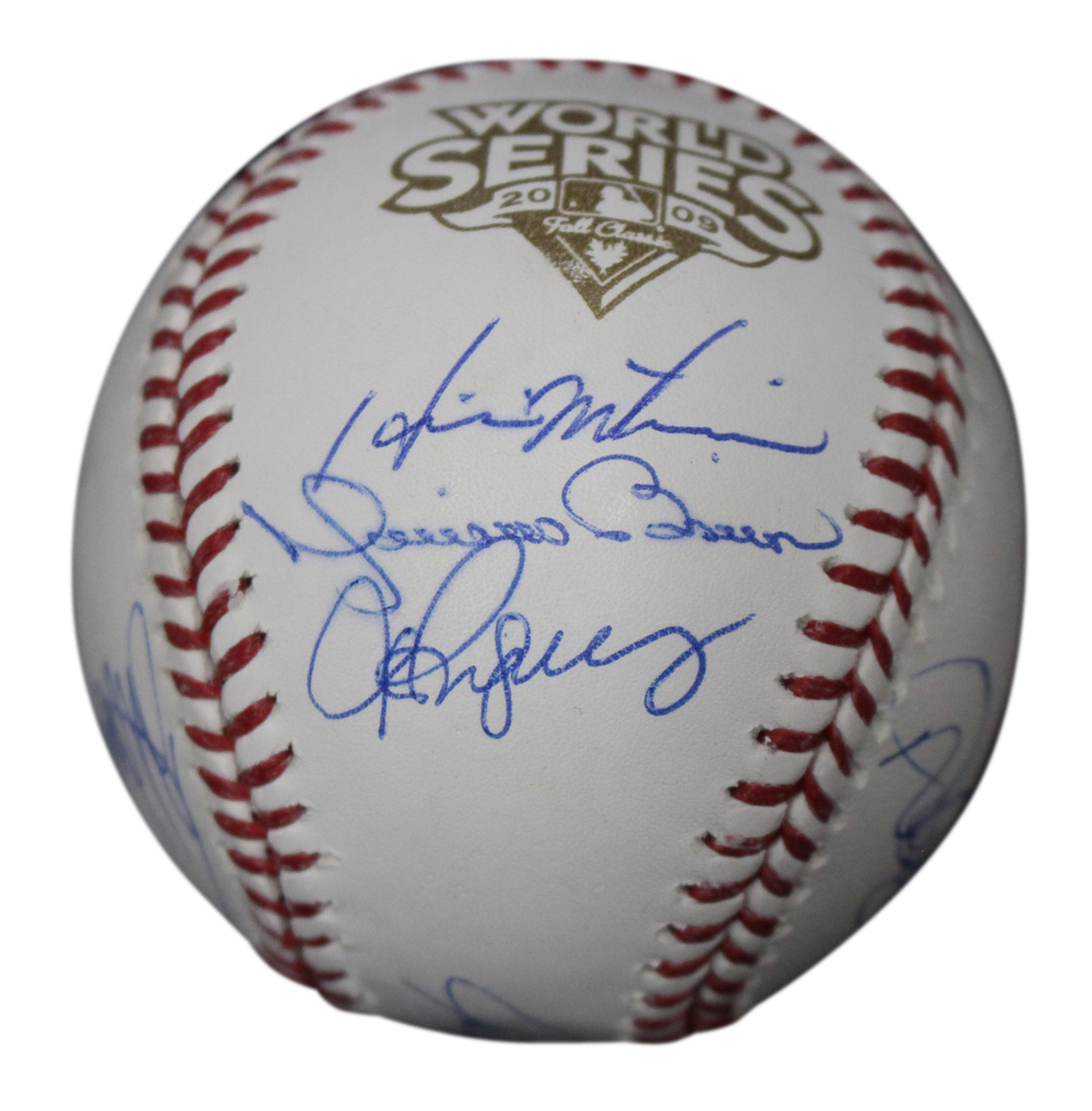 This is an official 2009 World Series baseball that was personally autographed by 9 members of the New York Yankees team including Jorge Posada, Andy Pettitte, Hideki Matsui, Mariano Rivera, Mark Teixeira, Johnny Damon, Joe Girardi, Alex Rodriguez and Derek Jeter. This is the exact item that you will receive so please see pictures for condition. Includes a certificate of authenticity from Steiner Sports and Denver Autographs.