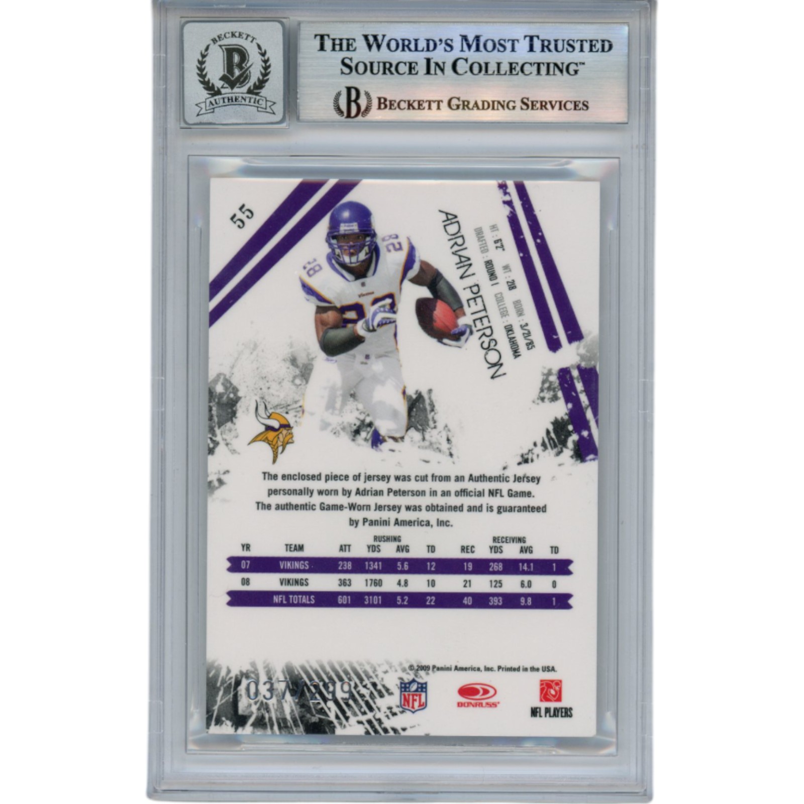 This is a Minnesota Vikings 2009 Panini RS Longevity Patch #55 Slabbed Trading Card that was personally autographed by Adrian Peterson. Includes a certificate of authenticity from Beckett Authentication Services (BAS) and Denver Autographs.