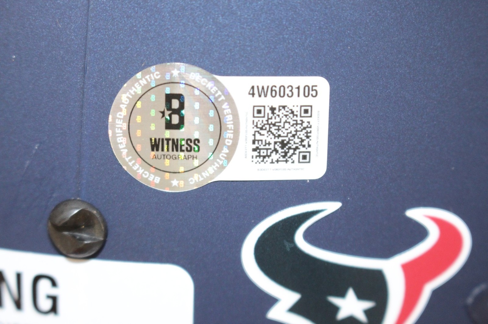The number in the listing title is just an inventory sku for our records and is not the authentication number. The item pictured is a stock photo. There are multiple quanities of this item. Each of these items is unique because they are individually hand-signed. While the photographs accurately represent the item itself, please note that the signature’s size, exact placement, and strength may differ on the one you receive. This is a Houston Texans Full Size Replica AMP Helmet that was personally autographed by Andre Johnson. Includes a certificate of authenticity / hologram from Beckett Authentication Services (BAS) and Denver Autographs. This is a BAS Witnessed Protection Program item which means a Beckett Authentication Service representative was present when this item was being signed. FREE SHIPPING within the USA on orders over $99!