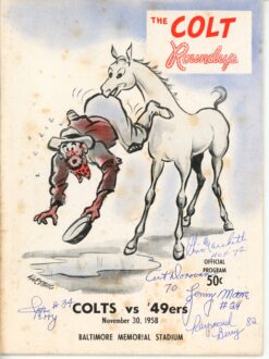 The number in the listing title is just an inventory sku for our records and is not the authentication number. The item pictured is the exact item you will receive please see photo for condition. This is a Baltimore Colts 1958 Colt Roundup 11/30 vs. 49ers Magazine that was personally autographed by Raymond Berry, Lenny Moore, Gine Marchetti, Art Donovan, and Joe Perry. Includes a certificate of authenticity / hologram from James Spence Authentication (JSA) and Denver Autographs. FREE SHIPPING within the USA on orders over $99!