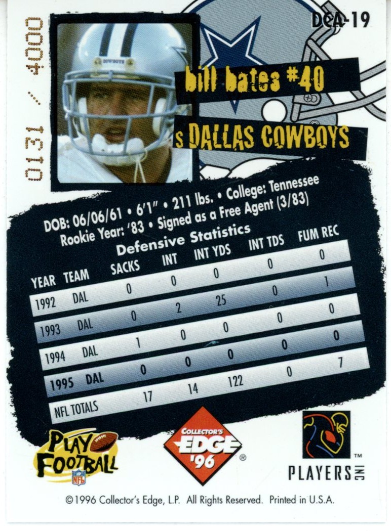 Bill Bates Autographed Dallas Cowboys 1996 Collector’s Edge #DCA-19 Card 55981