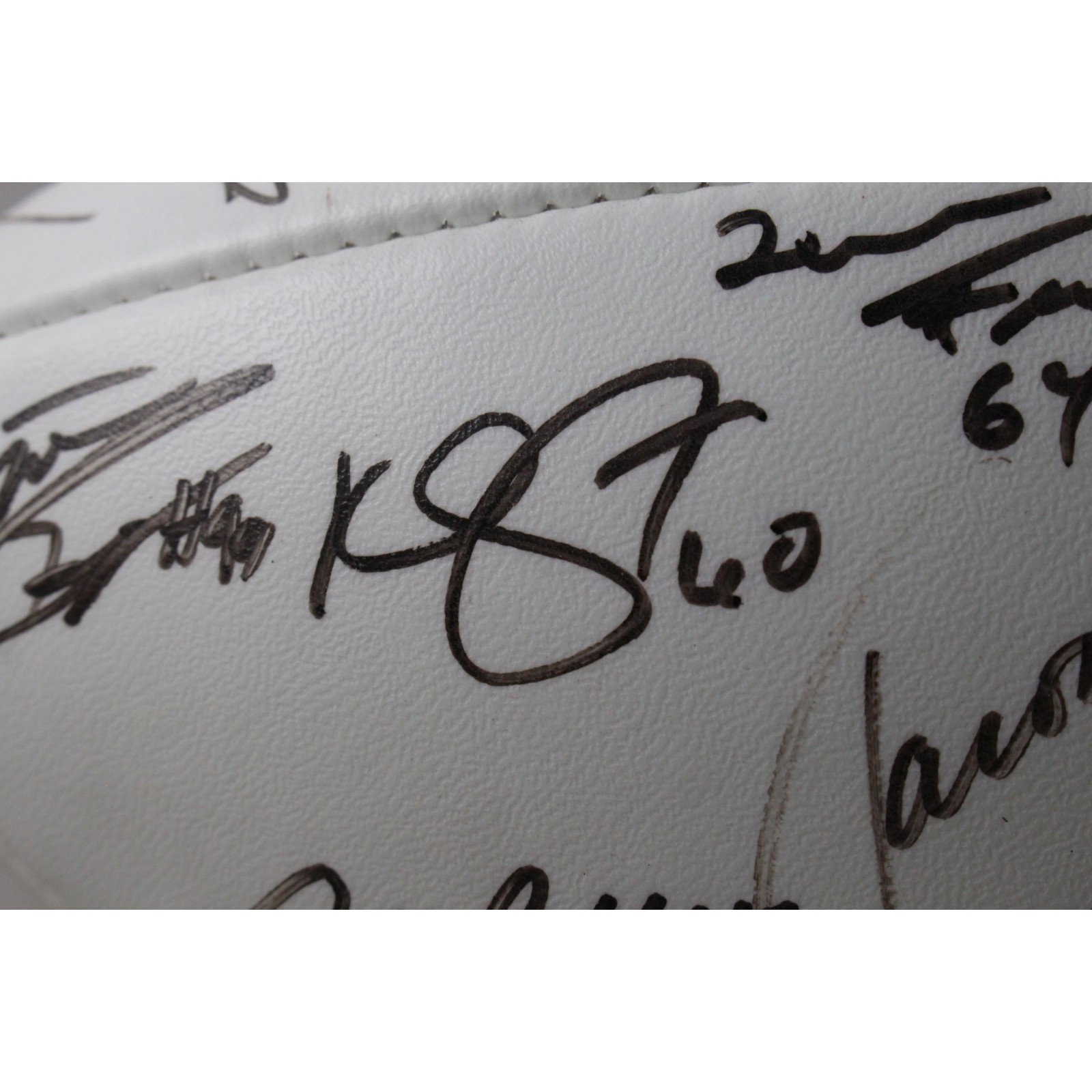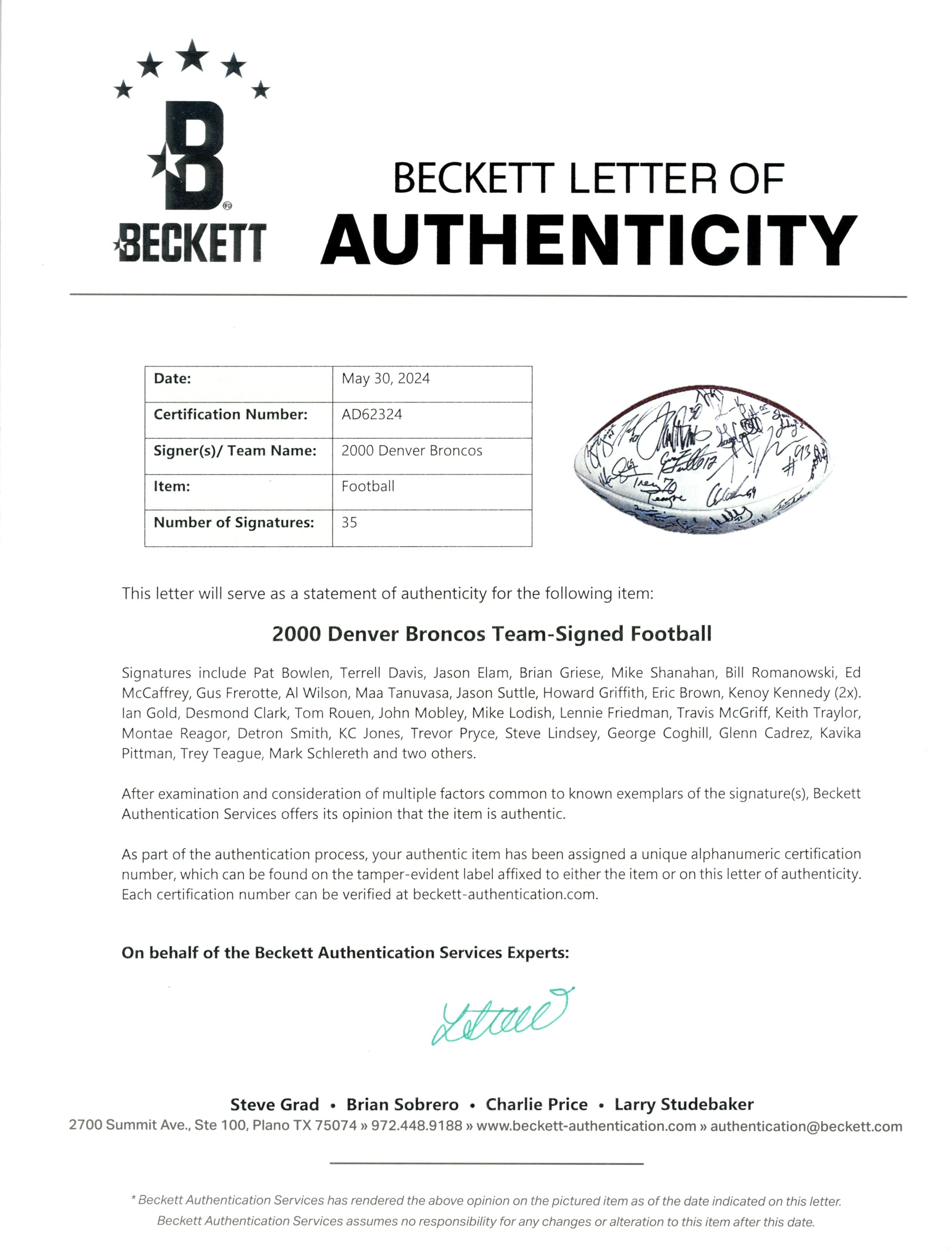 The number in the listing title is just an inventory sku for our records and is not the authentication number. The item pictured is the exact item you will receive, please see photos for condition. This is a Denver Broncos 2000 Team Multi-Signed 35 Total Signatures Football that was personally autographed by Pat Bowlen, Terrell Davis, Jason Elam, Brian Griese, Mike Shanahan, Bill Romanowski, Ed McCaffrey, Gues Frerotte, Al Wilson, Maa Tanuvasa, Jason Suttle, Howard Griffith, Eric Brown, Kenoy Kennedy (signed twice), Ian Gold, Desmond Clark, Tom Rouen, John Mobley, Mike Lodish, Lennie Friedman, Travis McGriff, Keith Traylor, Montae Reagor, Detron Smith, KC Jones, Trevor Pryce, Steve Lindsey, George, Coghill, Glenn Cadrez, Kavika Pittman, Trey Teague, Mark Schlereth, and two others. Please note that this ball does not hold air and is being sold AS IS. Includes a certificate of authenticity / hologram from Beckett Authentication Services (BAS) and Denver Autographs. FREE SHIPPING within the USA on orders over $99!