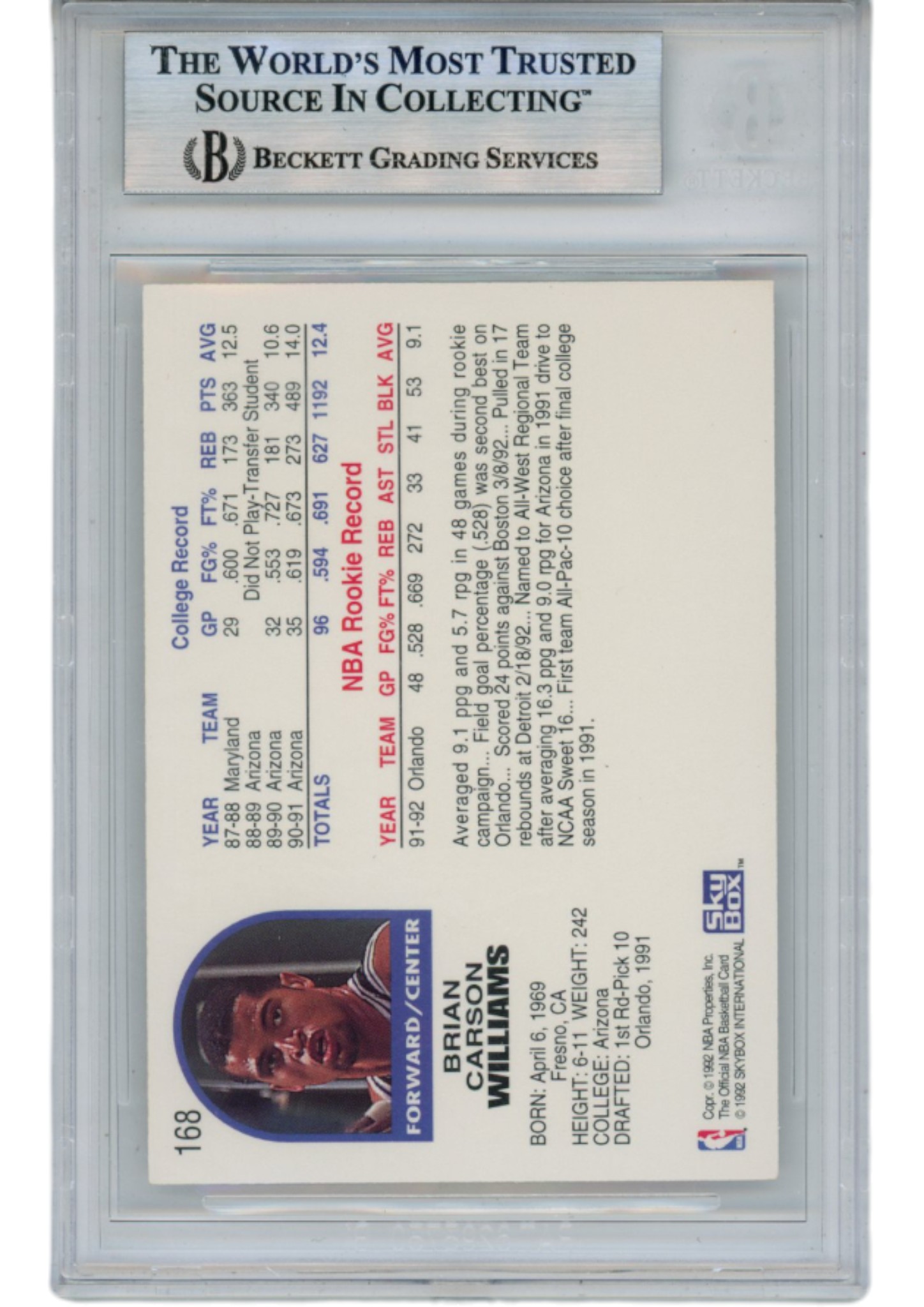 Brian Williams Autographed 92-93 Hoops #168 Slabbed Trading Card Beckett 52714