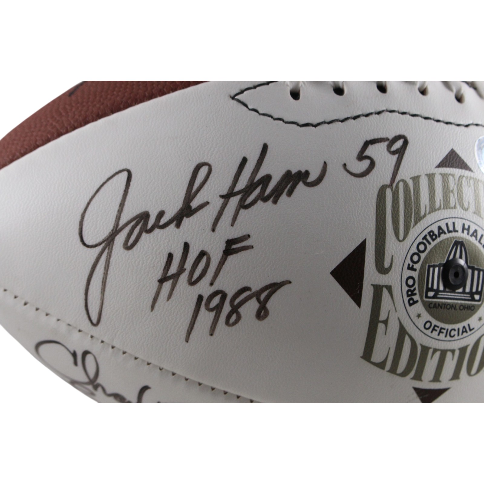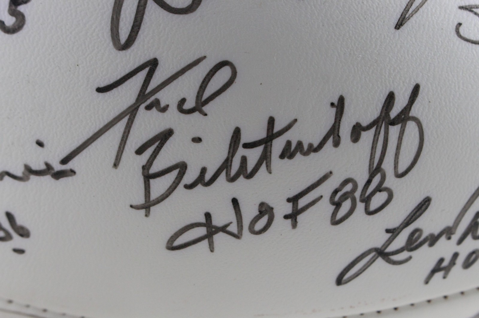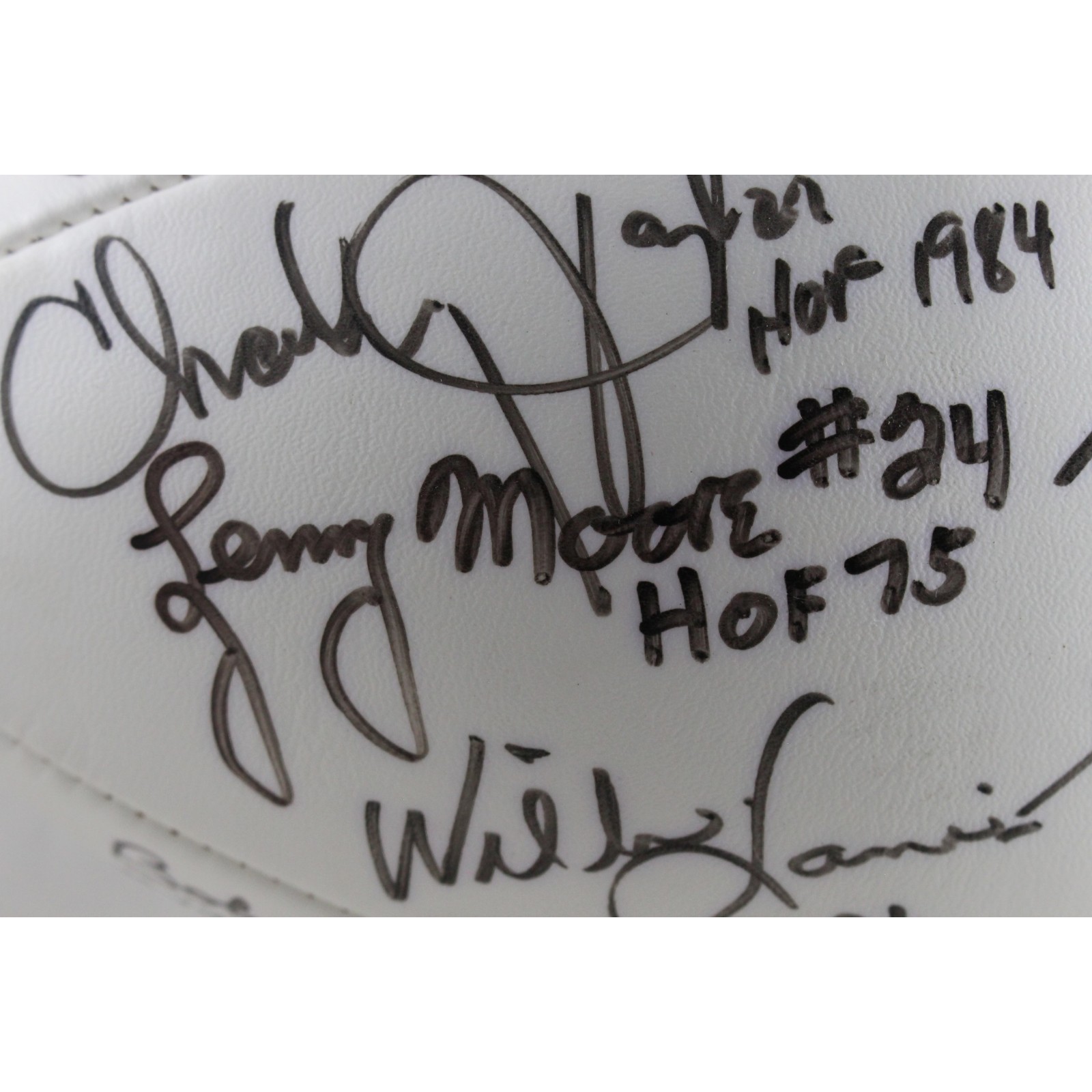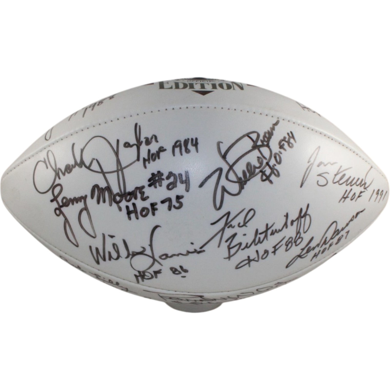 The number in the listing title is just an inventory sku for our records and is not the authentication number. The item pictured is the exact item you will receive, please see photos for condition. This is a NFL Hall of Famers Multi-Signed 13 Total Signatures Football that was personally autographed by Jack Ham (HOF 88), Dick Butkus (HOF 79), Charley Taylor (HOF 1984), Lenny Moore (HOF 75), Willie Lanier (HOF 86), Willie Brown (HOF 84), Fred Biletnikoff (HOF 88), Jan Stenerud (HOF 1991), Len Dawson (HOF 87), Bob Lilly (HOF 80), Randy White (HOF 94), Tony Dorsett (HOF 94), and Raymond Berry (HOF 73). Includes a certificate of authenticity / hologram from Beckett Authentication Services (BAS) and Denver Autographs. FREE SHIPPING within the USA on orders over $99!