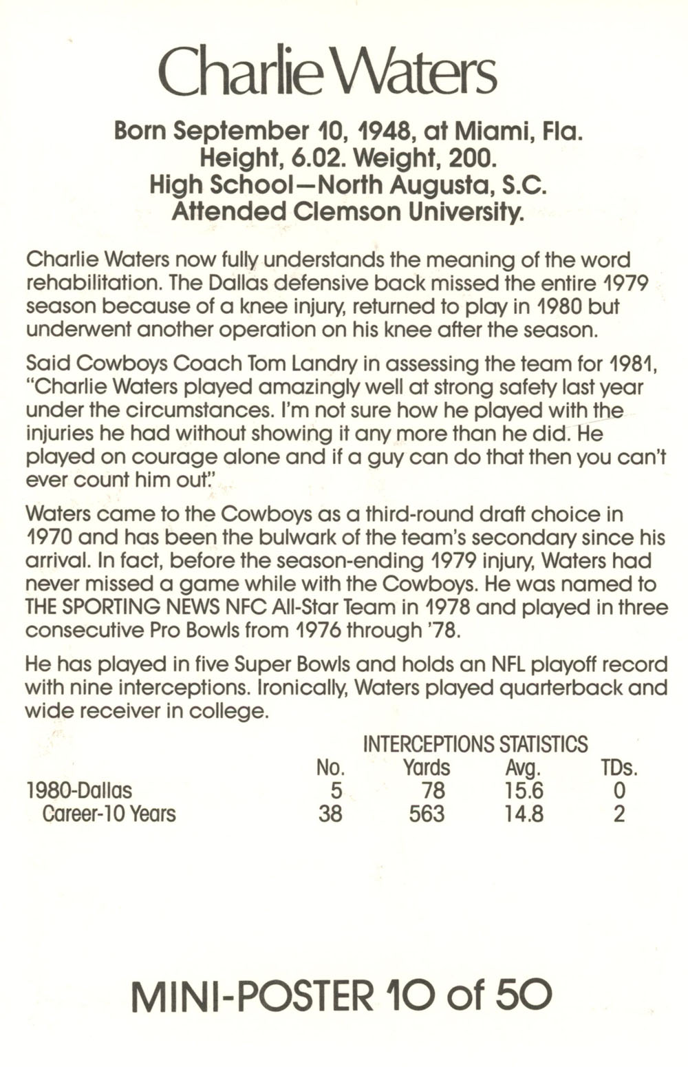 Charlie Waters Dallas Cowboys Mini Poster 10/50 Marketcom 46198