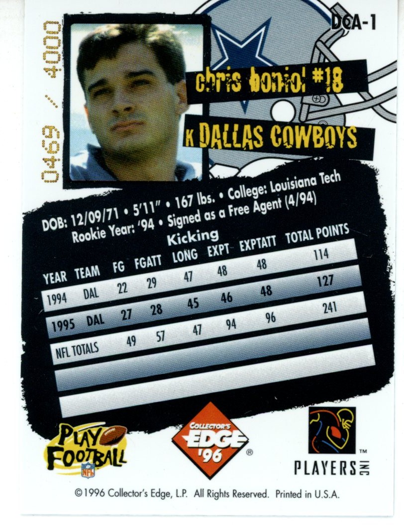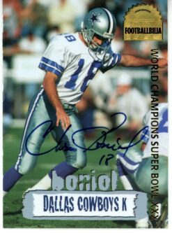 The number in the listing title is just an inventory sku for our records and is not the authentication number. This is a Dallas Cowboys Cowboybillia 1996 Collector’s Edge #DCA-1 that was personally autographed by Chris Boniol. Includes a certificate of authenticity from Denver Autographs. Free Shipping on items over $99!