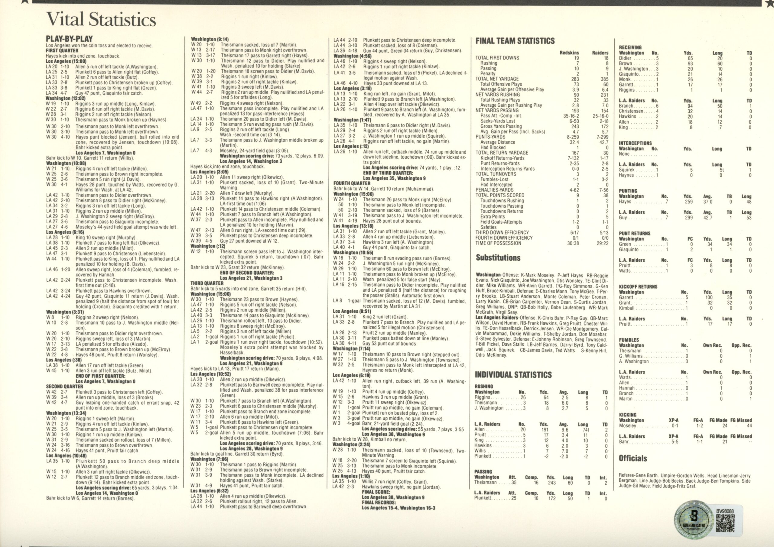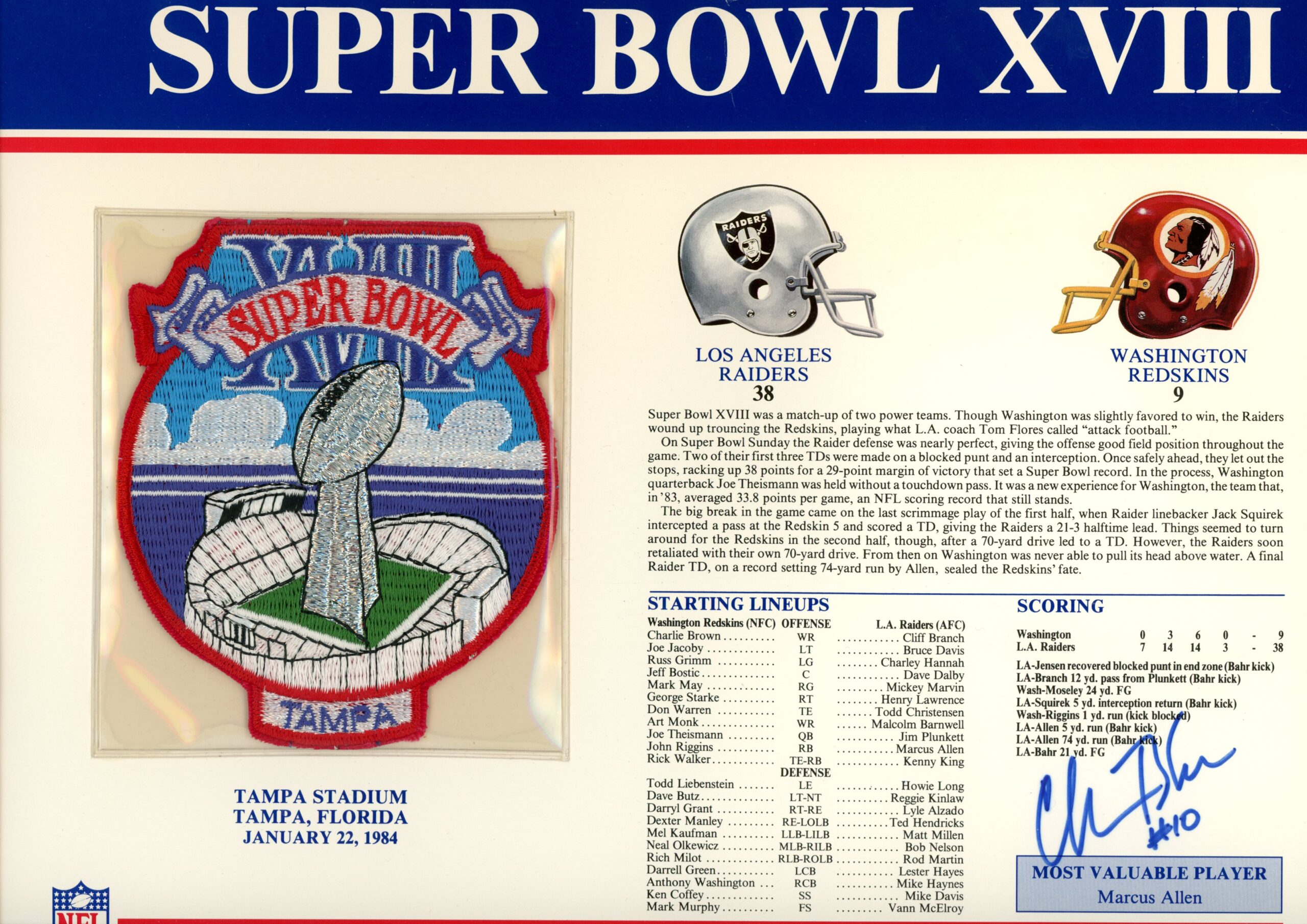 The number in the listing title is just an inventory sku for our records and is not the authentication number. The item pictured is the exact item you will receive please see photos for condition. This is a Los Angeles Raiders Super Bowl XVIII Willabee & Ward Patch Stat Card that was personally autographed by Chris Bahr. Includes a certificate of authenticity / hologram from Beckett Authentication Services (BAS) and Denver Autographs. FREE SHIPPING within the USA on orders over $10!