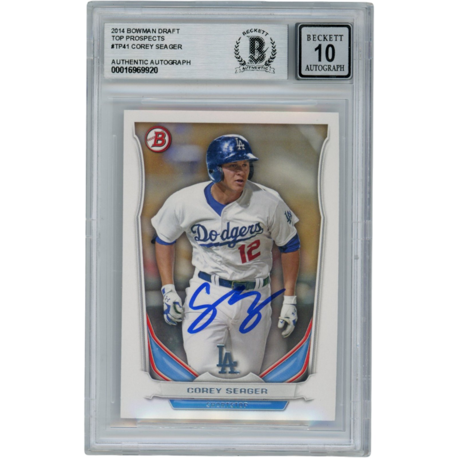 Corey Seager Autographed 2014 Bowman Draft #TP41 Slabbed Card Beckett 54579