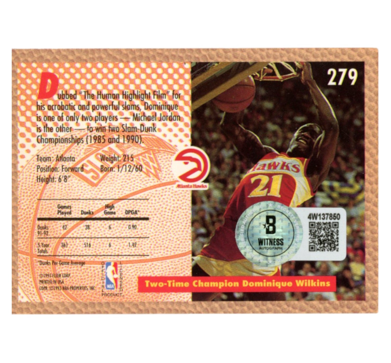 The number in the listing title is just an inventory sku for our records and is not the authentication number. The item pictured is the exact item you will receive, please see photos for condition. This is a Atlanta Hawks 1993 Fleer #279 Trading Card that was personally autographed by Dominique Wilkins. Includes a certificate of authenticity / hologram from Beckett Authentication Services (BAS) and Denver Autographs. This is a BAS Witnessed Protection Program item which means a Beckett Authentication Service representative was present when this item was being signed. FREE SHIPPING within the USA on orders over $99!