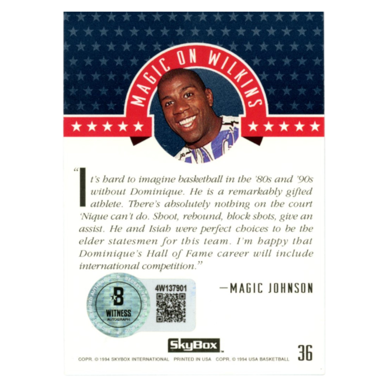 Dominique Wilkins Autographed 1994 SkyBox #36 Trading Card Beckett 54136