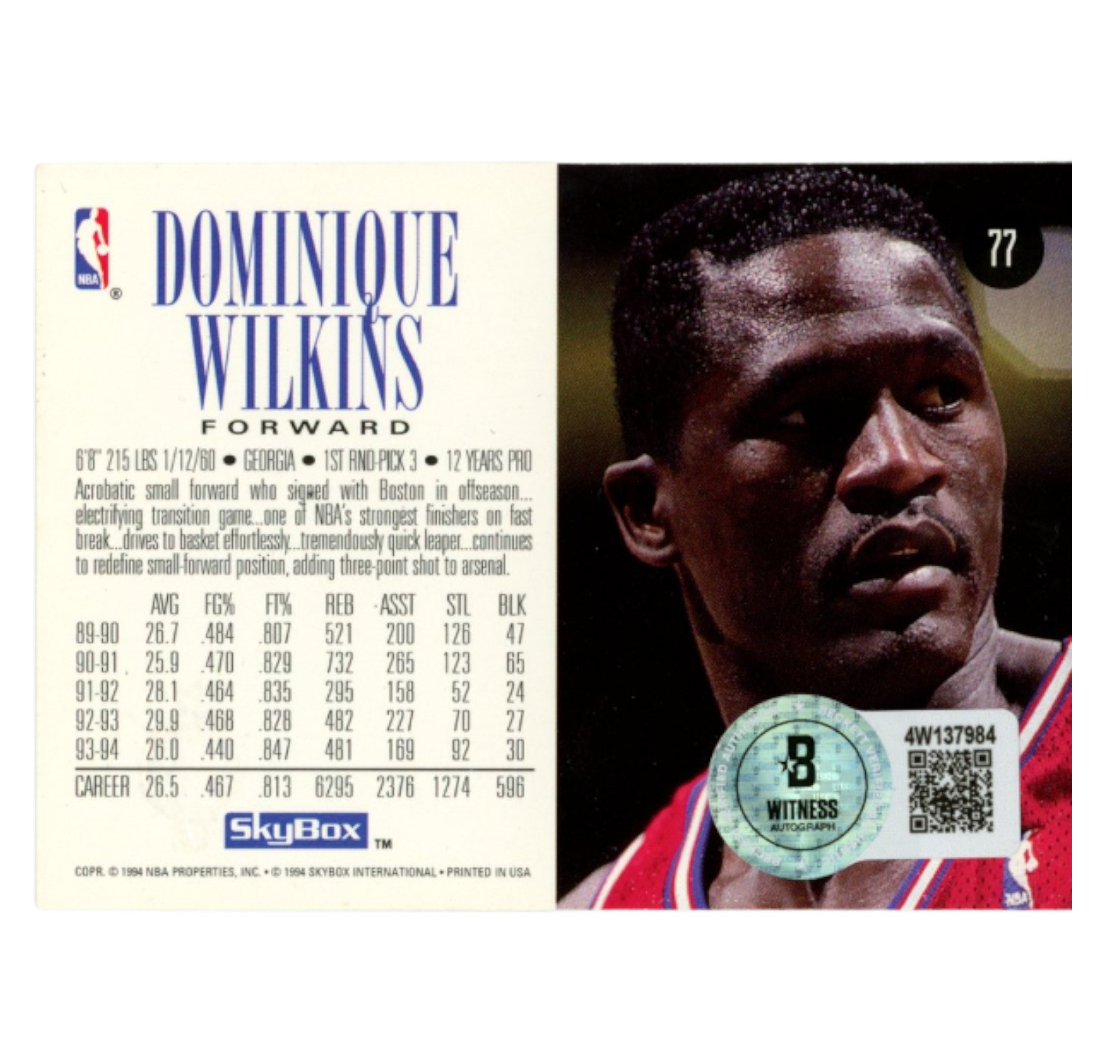 Dominique Wilkins Autographed 1994 Skybox #77 Trading Card Beckett 54129
