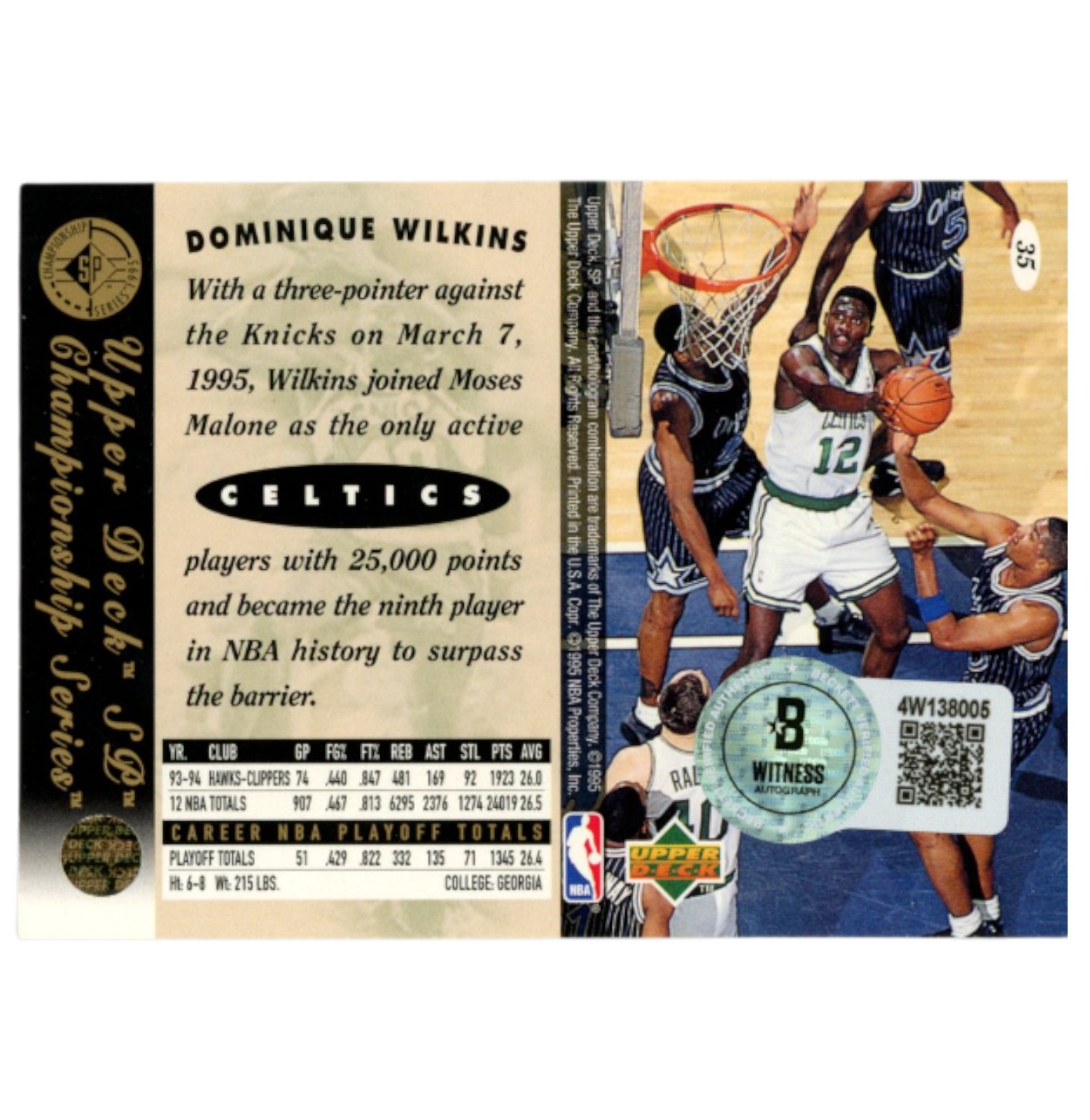 The number in the listing title is just an inventory sku for our records and is not the authentication number. The item pictured is a stock photo. There are multiple quanities of this item. Each of these items is unique because they are individually hand-signed. While the photographs accurately represent the item itself, please note that the signature’s size, exact placement, and strength may differ on the one you receive. This is a Boston Celtics 1995 Upper Deck #35 Trading Card that was personally autographed by Dominique Wilkins. Includes a certificate of authenticity / hologram from Beckett Authentication Services (BAS) and Denver Autographs. This is a BAS Witnessed Protection Program item which means a Beckett Authentication Service representative was present when this item was being signed. FREE SHIPPING within the USA on orders over $99!
