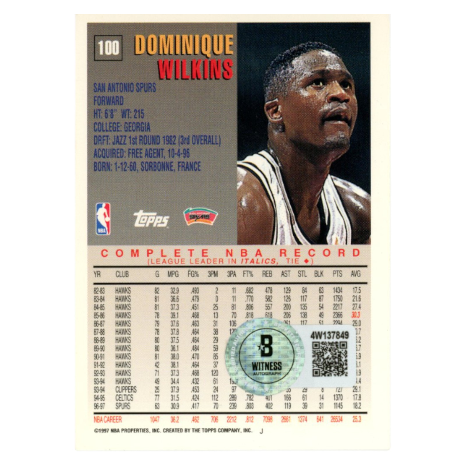 Dominique Wilkins Autographed 1997 Topps #100 Trading Card Beckett 54144