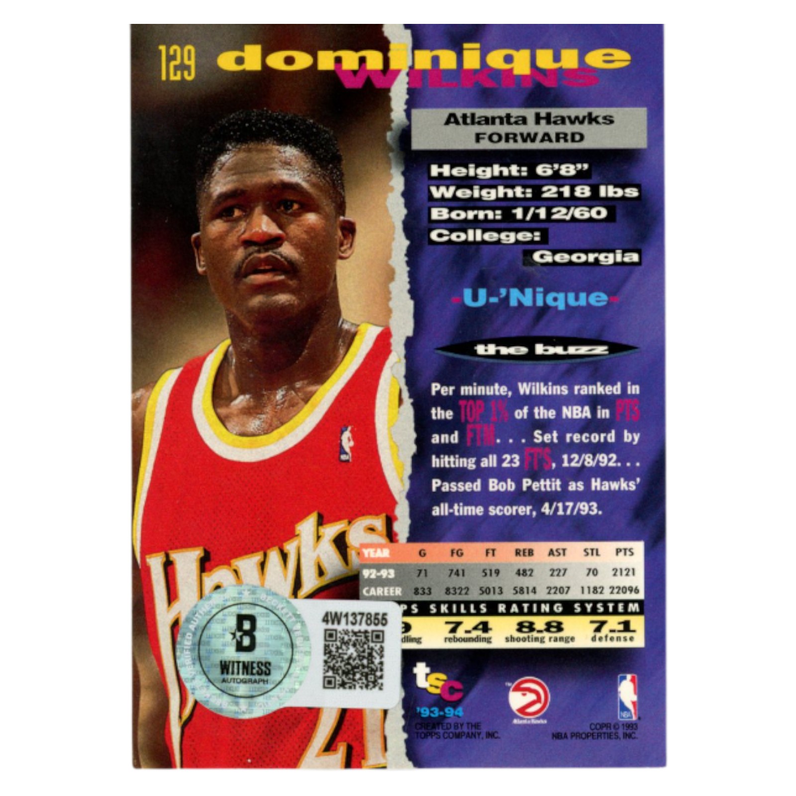 Dominique Wilkins Signed 1993 Topps Stadium Club #129 Trading Card Beckett 54222