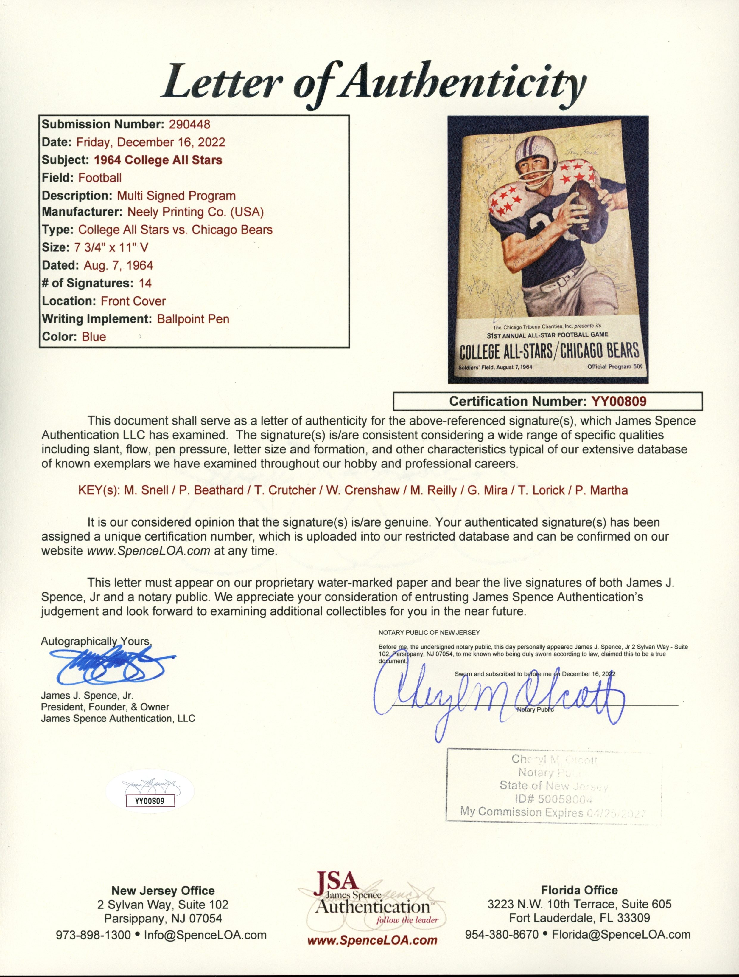 The number in the listing title is just an inventory sku for our records and is not the authentication number. The item pictured is the exact item you will receive please see photo for condition. This is a 1964 College All Stars vs. Chicago Bears Magazine that was personally autographed by Charles Michael Reilly, Hatch Rusdahl, Jack Concannon, John Meczuzak, Pete Beathard, Matt Snell, Paul Martha, Tony Lorick, Ruger Pillath, Tom Crutcher, Willis Crenshaw, George Mira, Mel Profit, and Duke Carlisle. Includes a certificate of authenticity / hologram from James Spence Authentication (JSA) and Denver Autographs. FREE SHIPPING within the USA on orders over $99!
