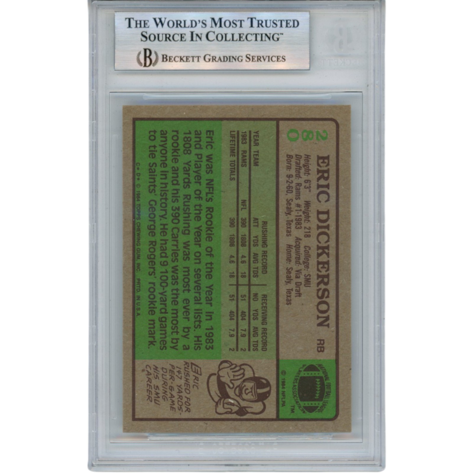 The number in the listing title is just an inventory sku for our records and is not the authentication number. The item pictured is the exact item you will receive, please see photos for condition. This is a Los Angeles Rams 1984 Topps #280 Slabbed Trading Card that was personally autographed by Eric Dickerson. Includes a certificate of authenticity / hologram from Beckett Authentication Services (BAS) and Denver Autographs. FREE SHIPPING within the USA on orders over $99!