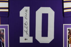 The number in the listing title is just an inventory sku for our records and is not the authentication number. The item pictured is the exact image you will receive, please see photos for condition. This is a Pro Style Purple Size XL Jersey with sewn on numbers that is framed in a 35×43 frame. This jersey was personally autographed by Fran Tarkenton includes “HOF” inscription. Includes a certificate of authenticity / hologram from Beckett Authentication Services (BAS) and Denver Autographs.