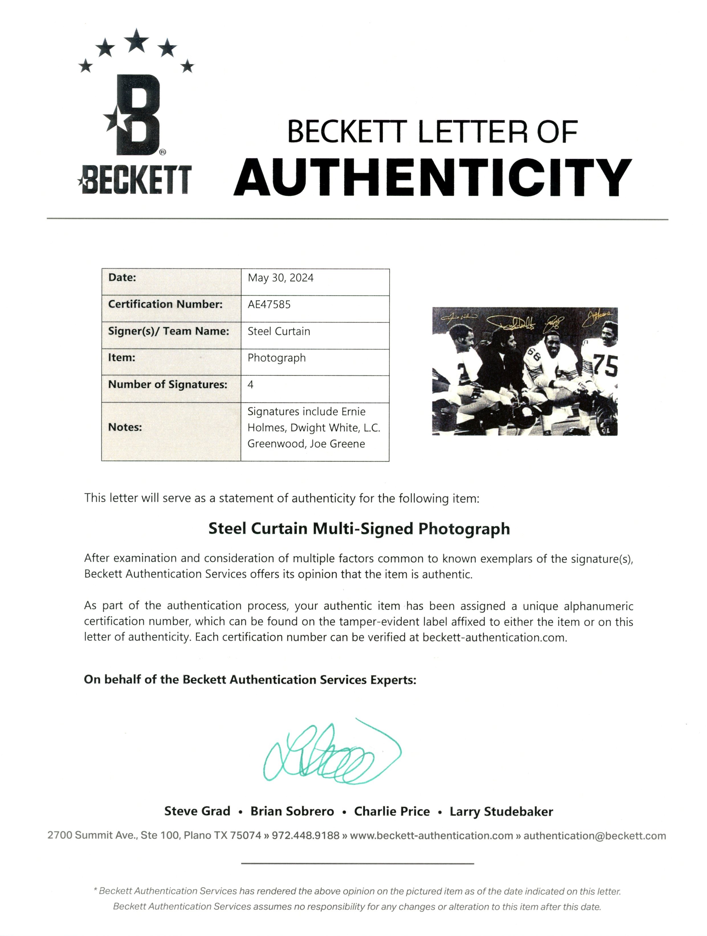 Greene Holmes Greenwood White Signed Pittsburgh Steelers 16×20 Photo BAS 55407
