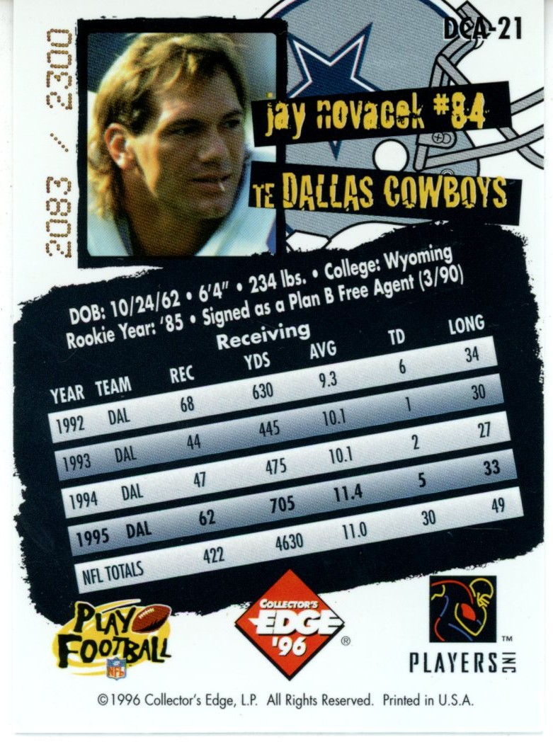 Jay Novacek Autographed Dallas Cowboys 1996 Collector’s Edge #DCA-21 Card 55983