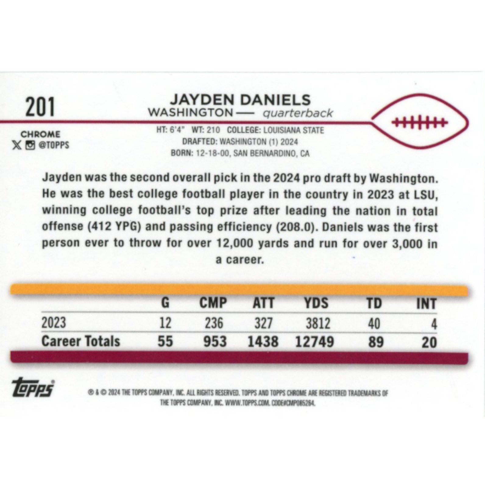 Jayden Daniels 2024 Topps Chrome #201 Teal Refractor #201 64/250 Rookie 59170