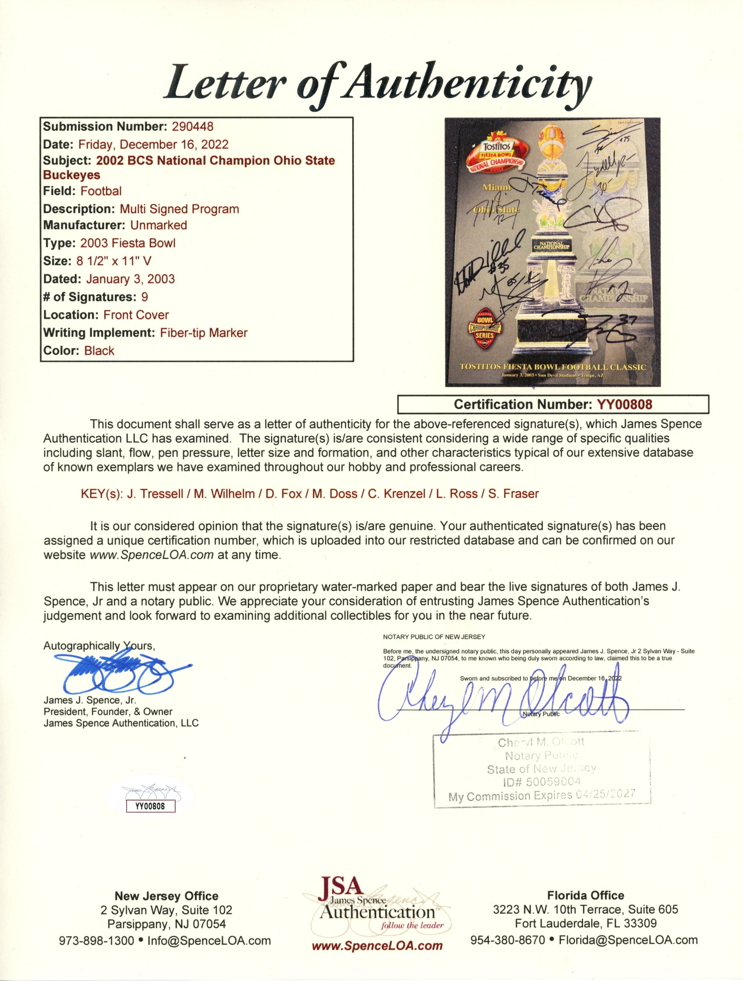 The number in the listing title is just an inventory sku for our records and is not the authentication number. The item pictured is the exact item you will receive please see photo for condition. This is a Ohio State Buckeyes 2003 Fiesta Bowl National Championship Magazine that was personally autographed by Jim Tressell, Matt Wilhelm, Dustin Fox, Mike Doss, Craig Krenzel, Lydell Ross, and Simon Fraser. Includes a certificate of authenticity / hologram from James Spence Authentication (JSA) and Denver Autographs. FREE SHIPPING within the USA on orders over $99!