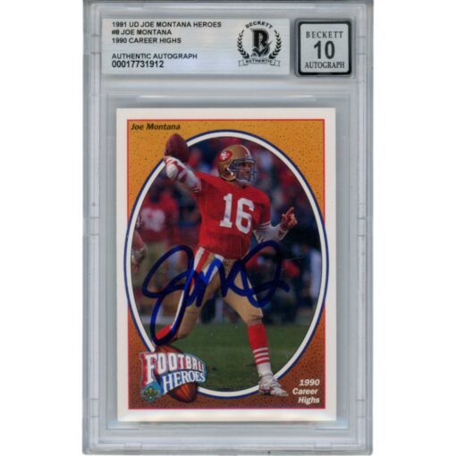 This is a San Francisco 49ers 1991 Upper Deck #8 Slabbed Trading Card that was personally autographed by Joe Montana. Includes a certificate of authenticity from Beckett Authentication Services (BAS) and Denver Autographs.