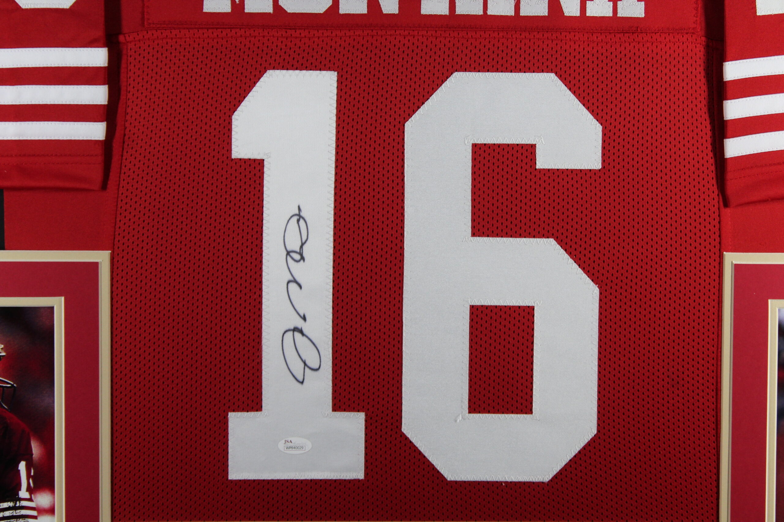 Joe Montana Autographed/Signed Pro Style Red XL Framed Jersey 35×43 JSA 53757