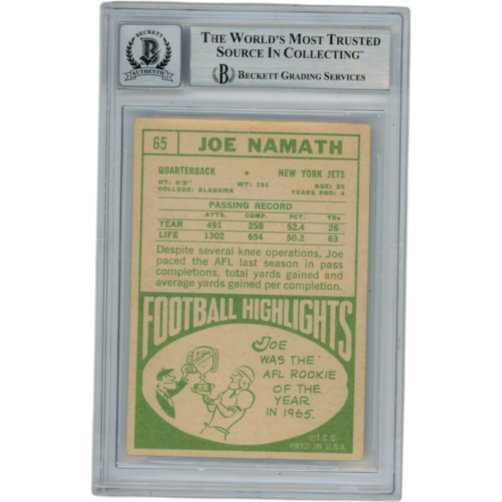 Joe Namath Autographed/Signed 1968 Topps #65 Slabbed Trading Card Beckett 53343