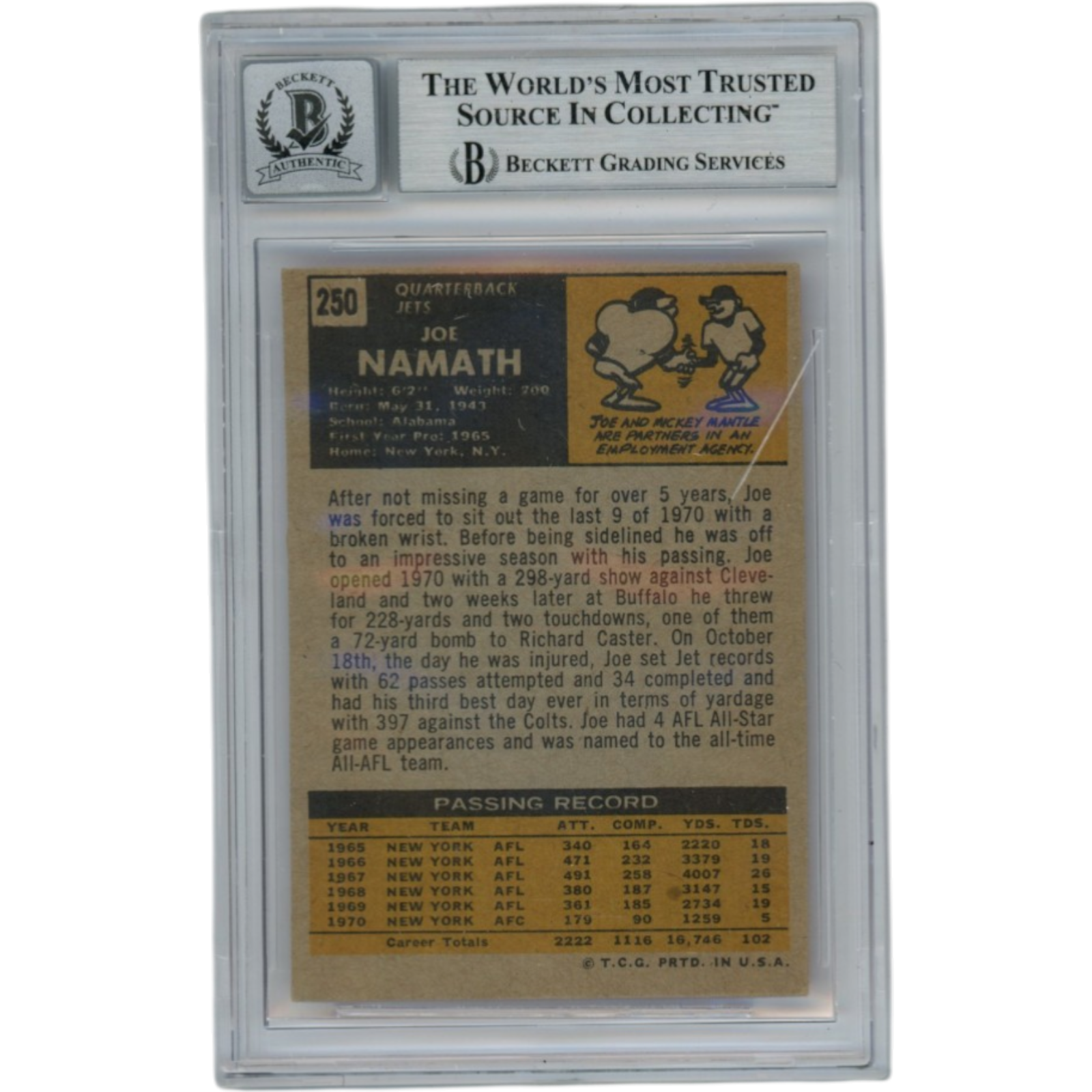 Joe Namath Autographed/Signed 1971 Topps #250 Slabbed Trading Card Beckett 53339