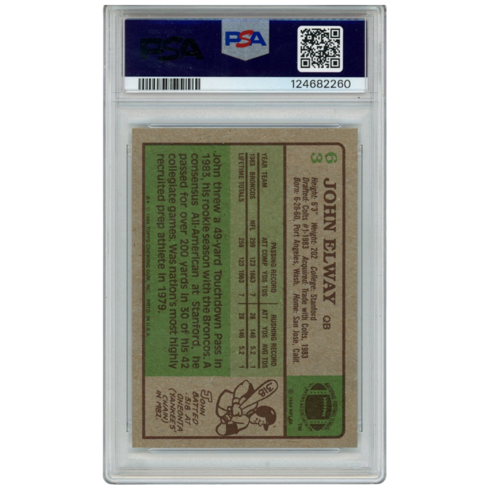 The number in the listing title is just an inventory sku for our records and is not the authentication number. The item pictured is the exact item you will receive, please see photos for condition. This is a Denver Broncos 1984 Topps #63 Slabbed Trading Card that was personally autographed by John Elway includes “HOF” and “MVP” inscriptions. Includes a certificate of authenticity / hologram from Professional Sports Authenticator (PSA) and Denver Autographs. FREE SHIPPING within the USA on orders over $10!