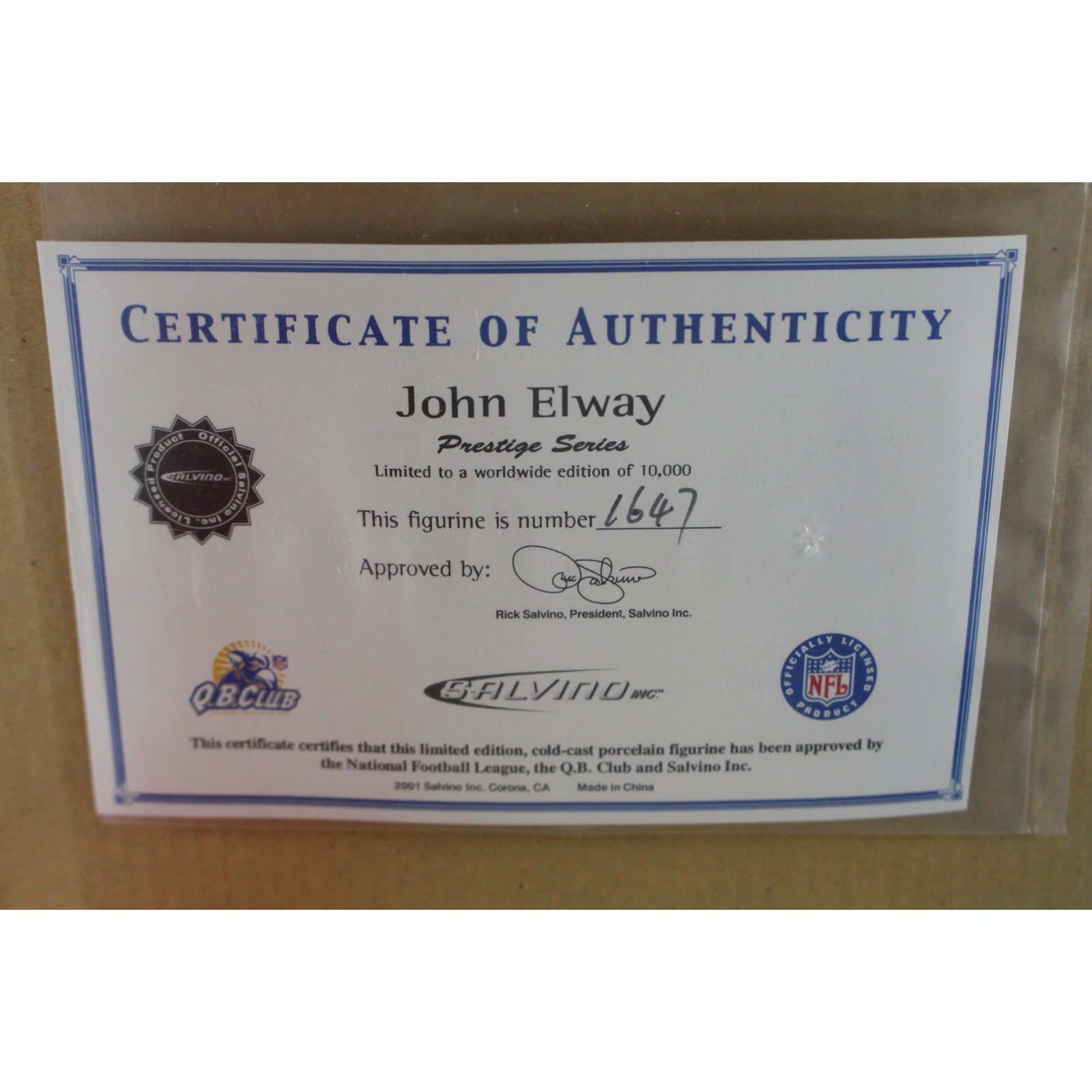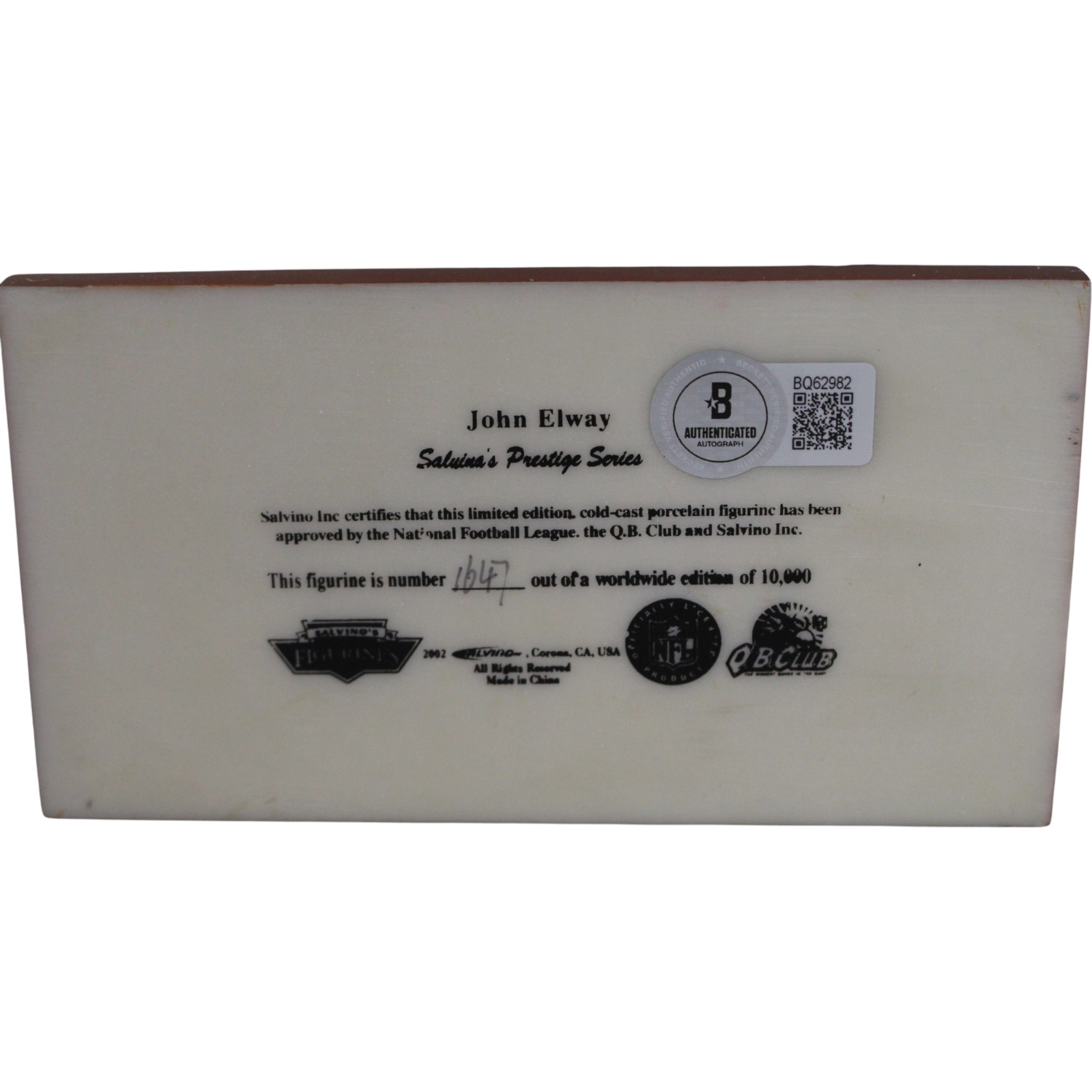 The number in the listing title is just an inventory sku for our records and is not the authentication number. The item pictured is the exact item you will receive, please see photos for condition. This is a Denver Broncos Salvino Porcelain Figure #1647 that was personally autographed by John Elway. Includes a certificate of authenticity from Beckett Authentication Services (BAS) and Denver Autographs. FREE SHIPPING within the USA on orders over $99!
