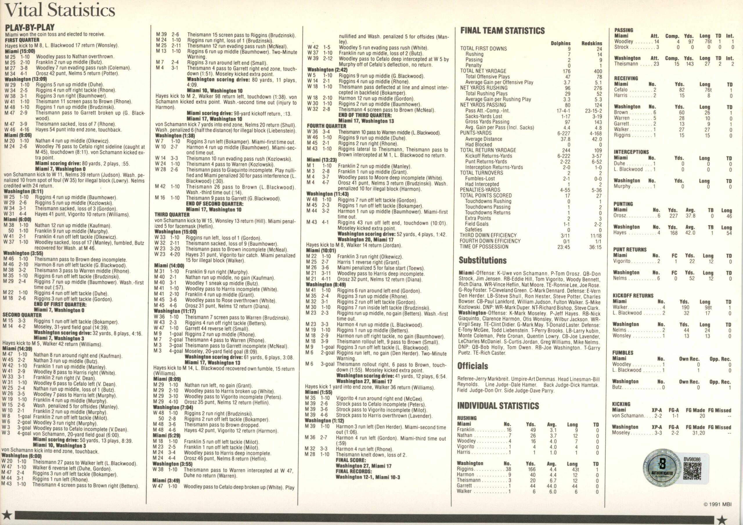 John Riggins Autographed Washington Redskins SB XVII Patch Card Beckett 54950