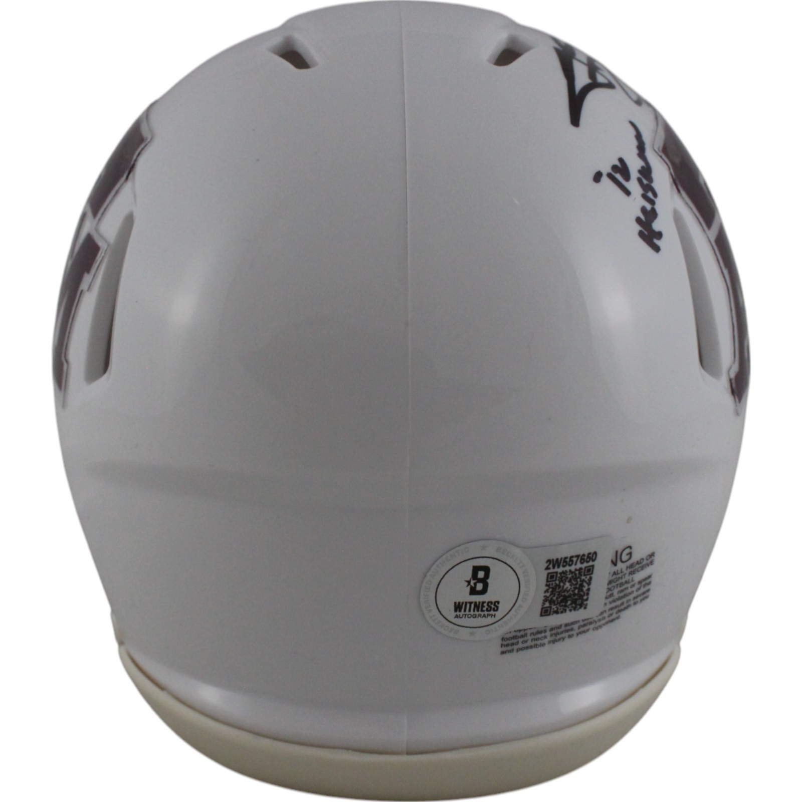 This is a Texas A&M Aggies White Mini Helmet that was personally autographed by Johnny Manziel includes ” ’12 Heisman” inscription. Includes a certificate of authenticity from Beckett Authentication Services (BAS) and Denver Autographs.