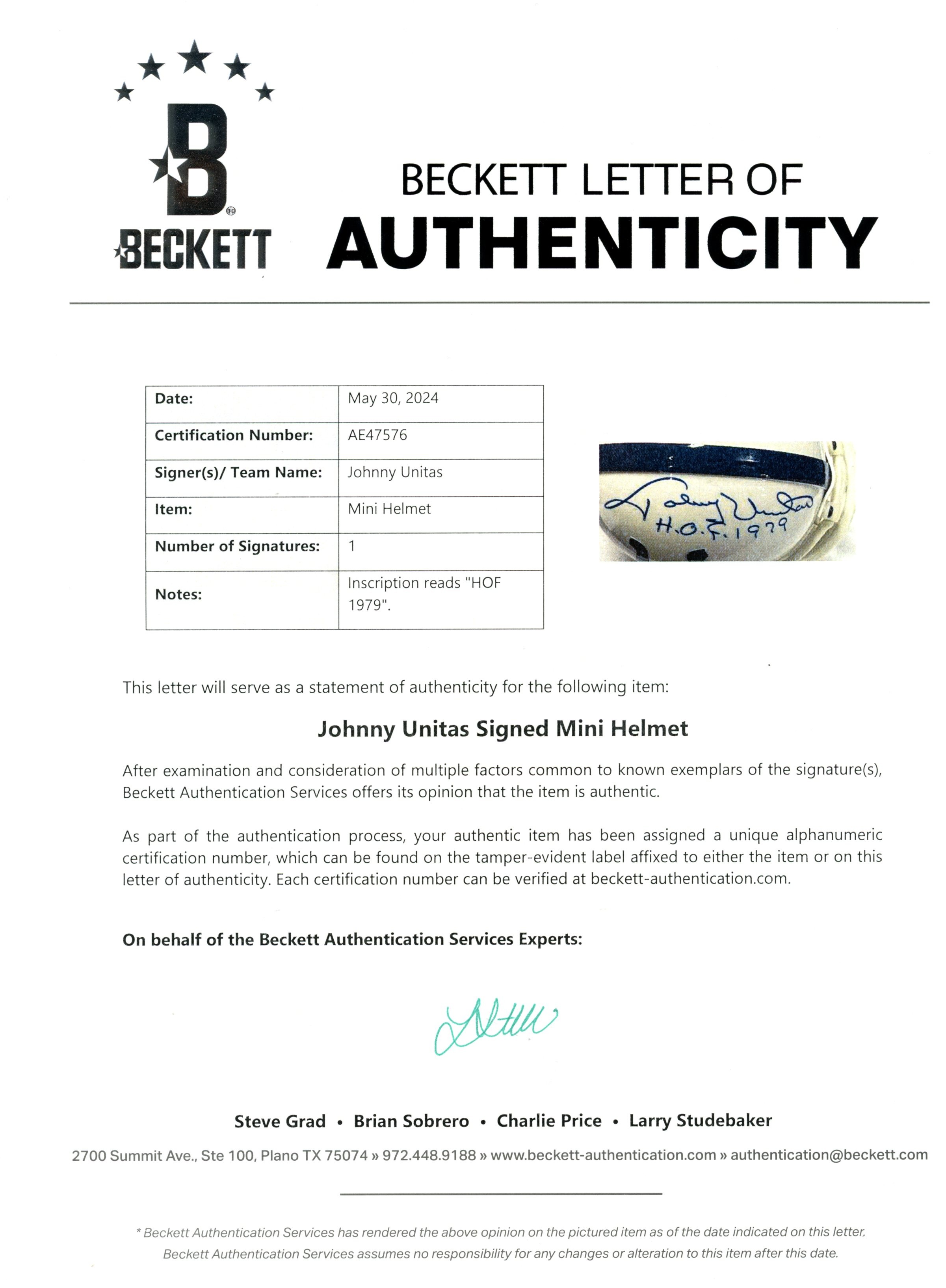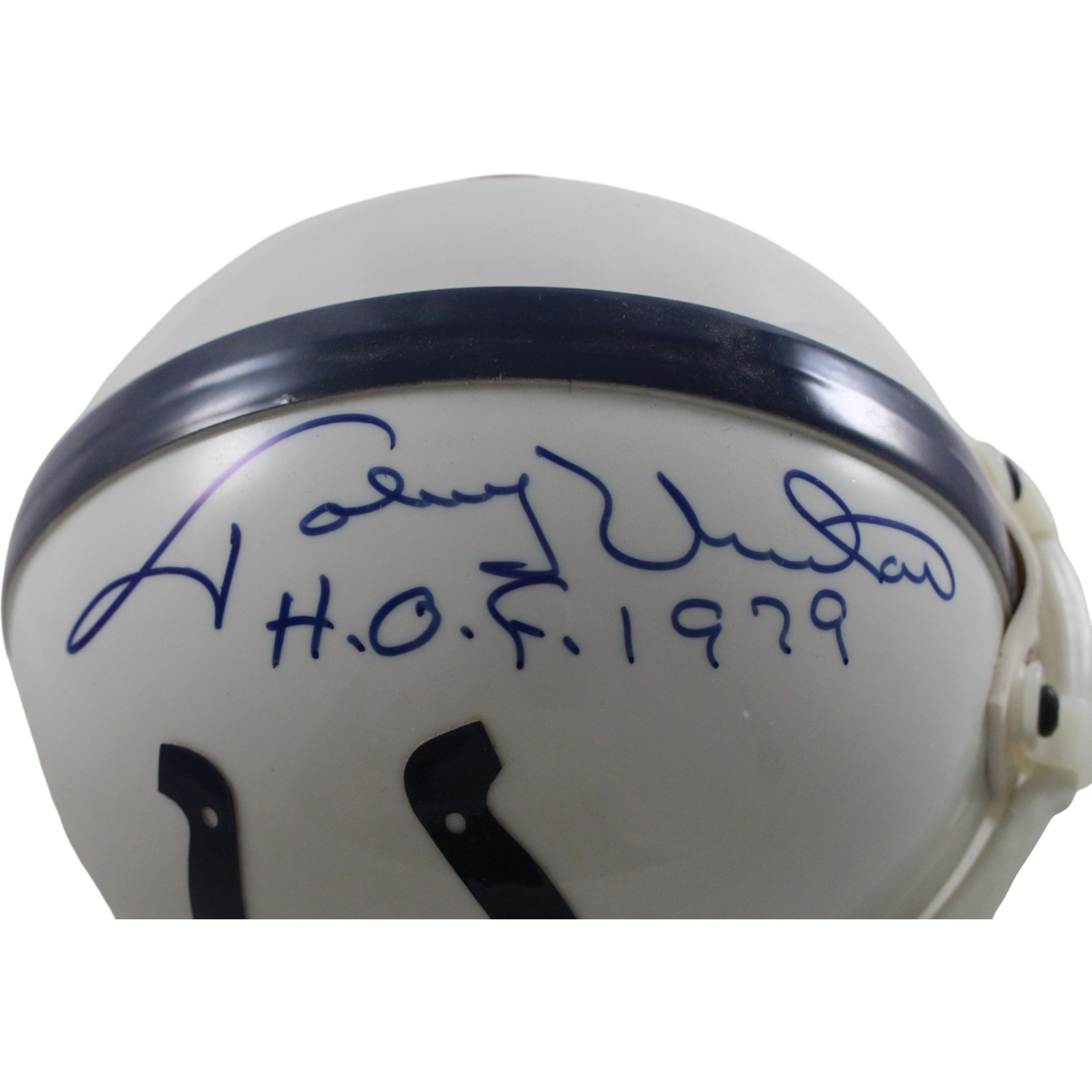 The number in the listing title is just an inventory sku for our records and is not the authentication number. The item pictured is the exact item you will receive, please see photos for condition. This is a Baltimore Colts VSR4 Replica Mini Helmet that was personally autographed by Johnny Unitas includes “HOF 1979” inscription. Includes a certificate of authenticity / hologram from Beckett Authentication Services (BAS) and Denver Autographs. FREE SHIPPING within the USA on orders over $99!