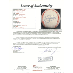 The number in the listing title is just an inventory sku for our records and is not the authentication number. The item pictured is the exact item you will receive please see photo for condition. This is a Minnesota Twins American League Baseball that was personally autographed by Kirby Puckett. Includes a certificate of authenticity / hologram from James Spence Authentication (JSA) and Denver Autographs. FREE SHIPPING within the USA on orders over $99!