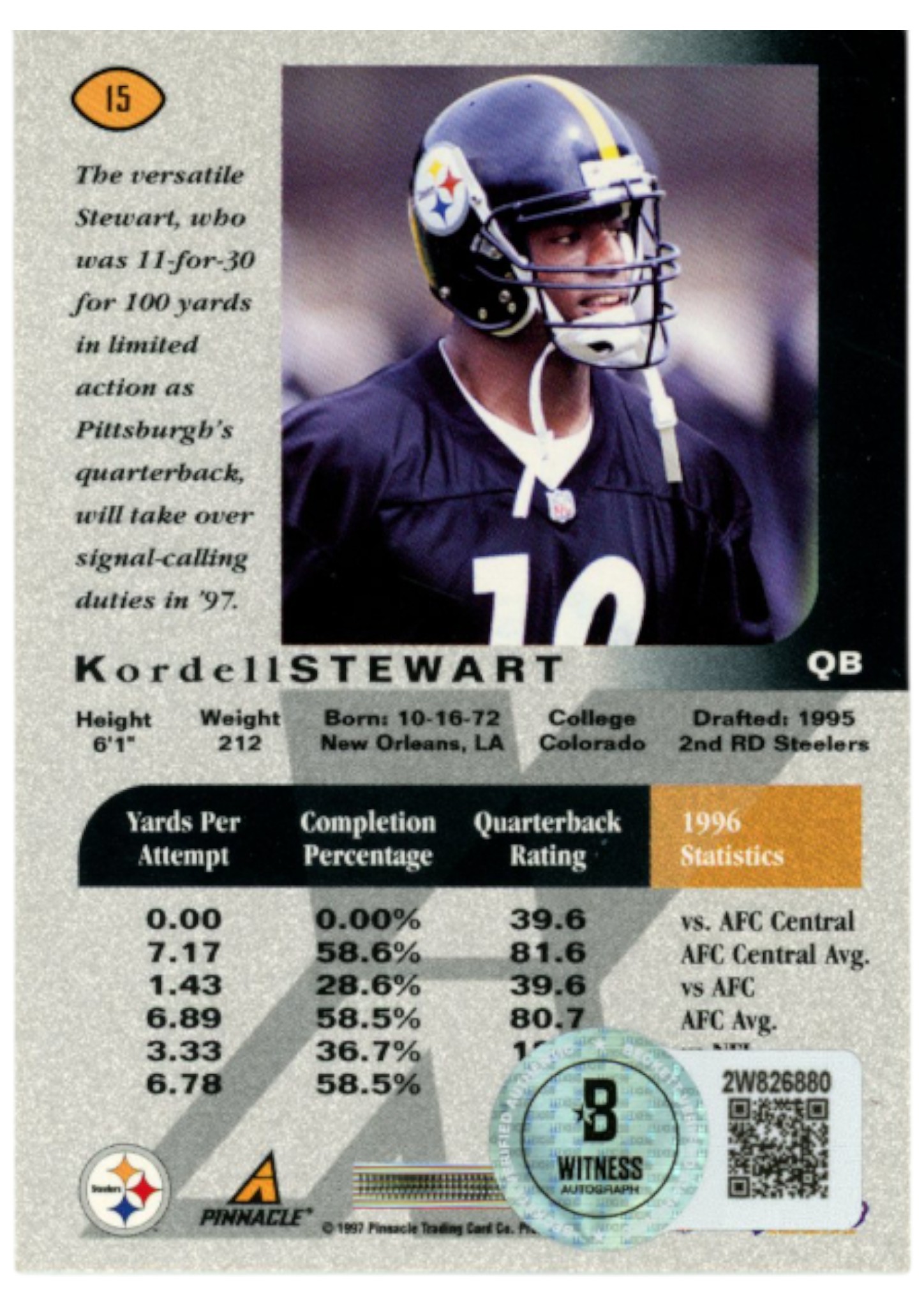 The number in the listing title is just an inventory sku for our records and is not the authentication number. The item pictured is the exact item you will receive, please see photos for condition. This is a Pittsburgh Steelers 1997 Pinnacle X-Press #15 Trading Card that was personally autographed by Kordell Stewart. Includes a certificate of authenticity from Beckett Authentication Services (BAS) and Denver Autographs. FREE SHIPPING within the USA on orders over $99!