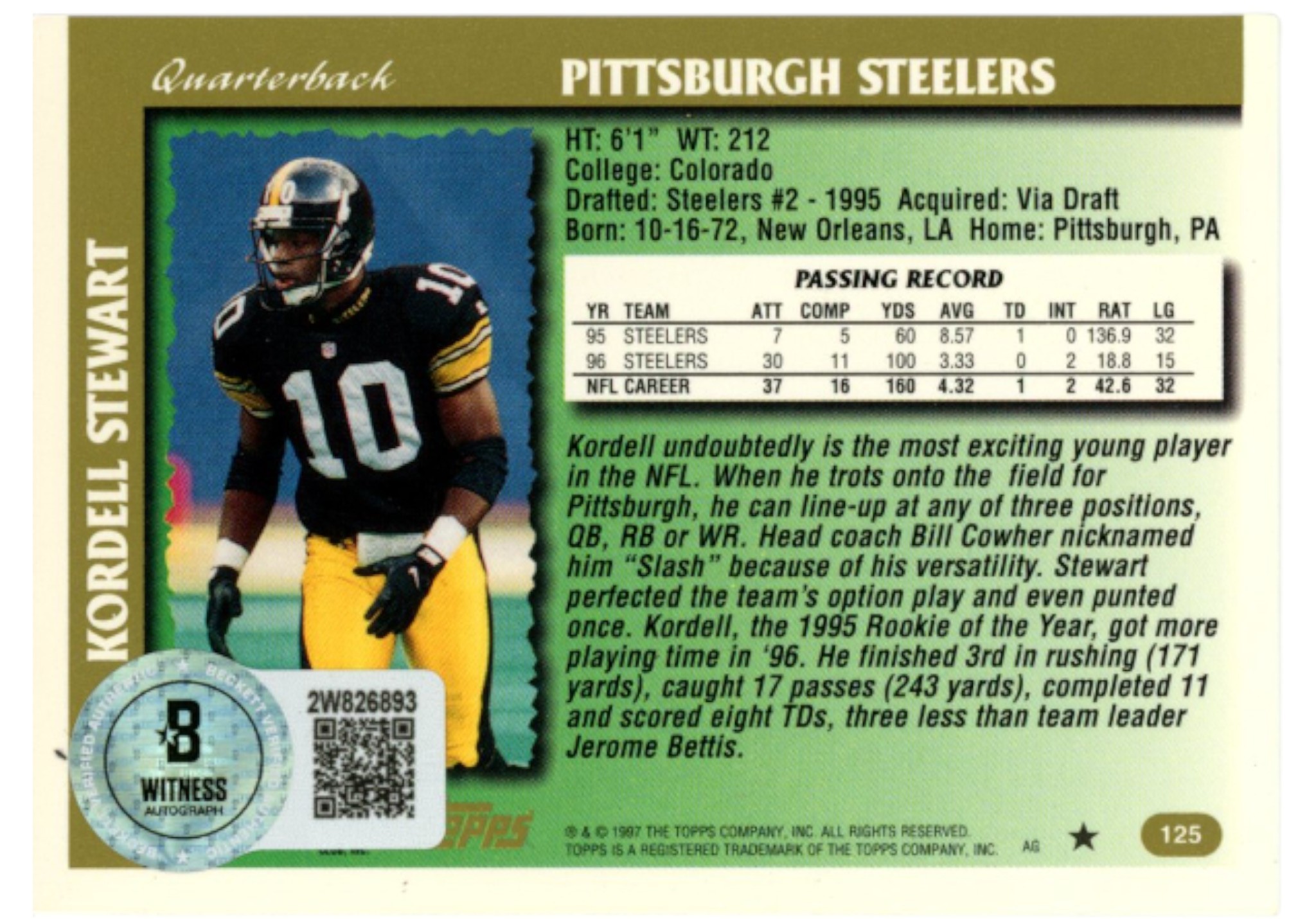 Kordell Stewart Autographed 97 Topps #125 Trading Card Beckett Witness 52809