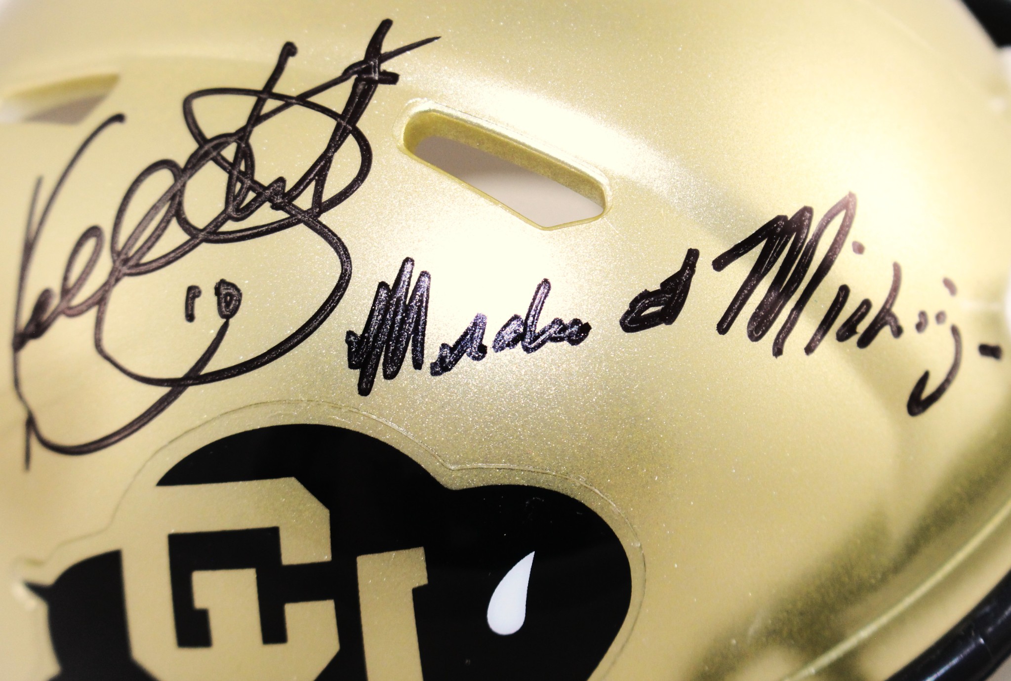 The number in the listing title is just an inventory sku for our records and is not the authentication number. The item pictured is a stock photo unless otherwise noted. This is a Colorado Buffaloes Gold Mini Helmet that was personally autographed by Kordell Stewart includes “Miracle at Michigan” inscription. Includes a certificate of authenticity from Beckett Authentication Services (BAS) and Denver Autographs. FREE SHIPPING within the USA on orders over $99!