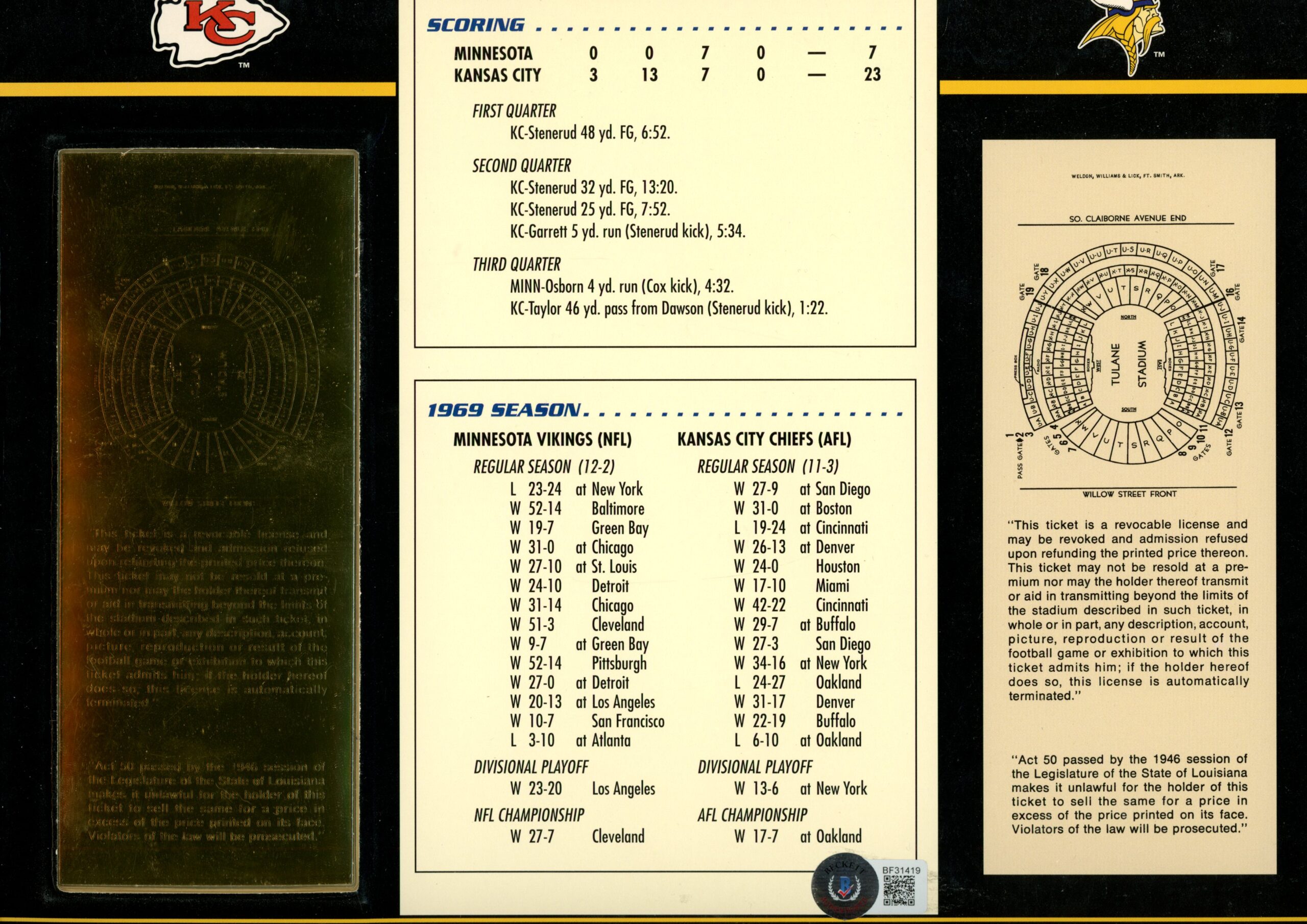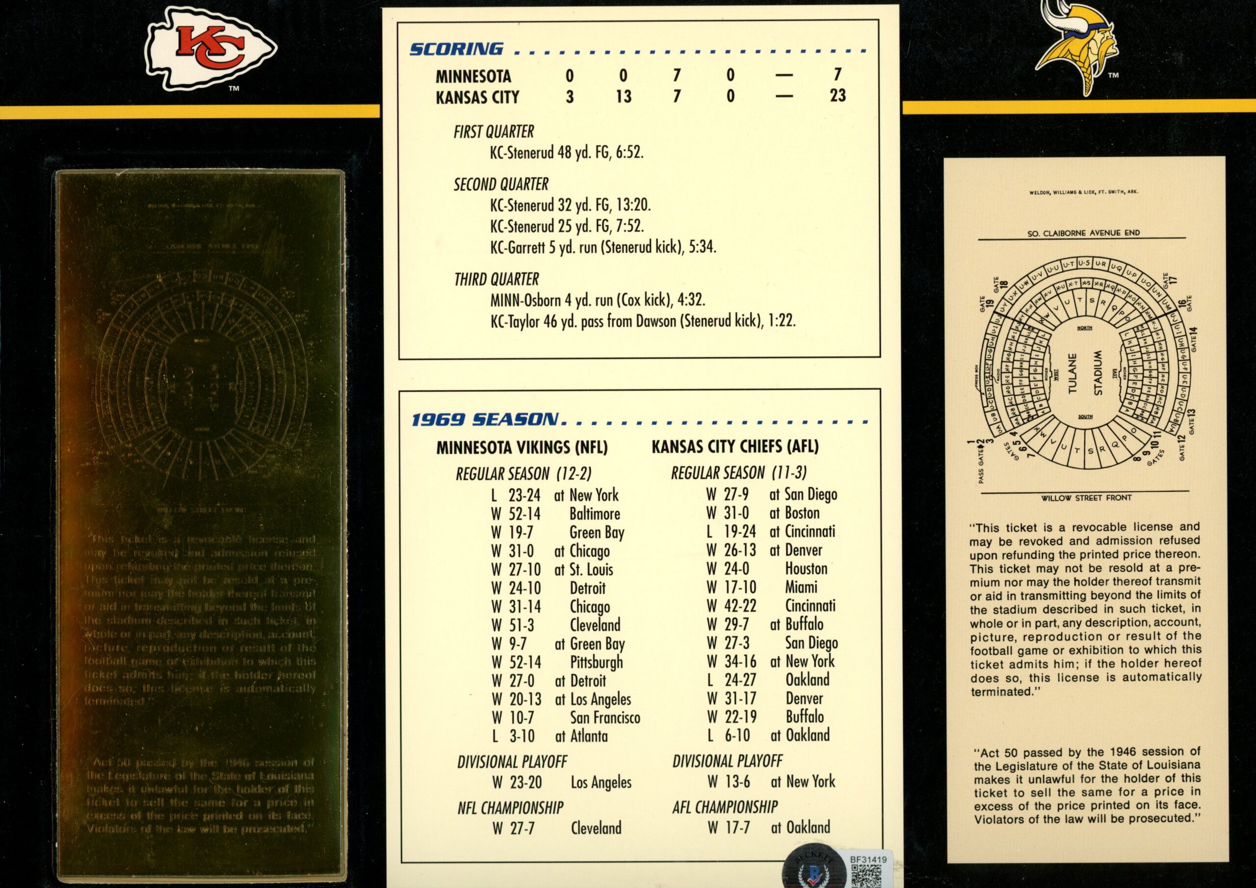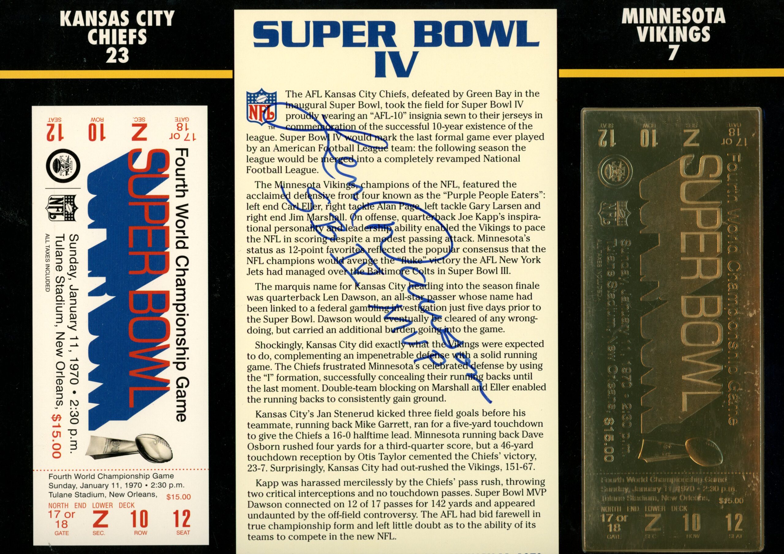 The number in the listing title is just an inventory sku for our records and is not the authentication number. The item pictured is the exact item you will receive, please see photos for condition. This is a Kansas City Chiefs Super Bowl IV 22 karat Gold Ticket Stat Card that was personally autographed by Len Dawson. Includes a certificate of authenticity / hologram from James Spence Authentication (JSA) and Denver Autographs. FREE SHIPPING within the USA on orders over $10!