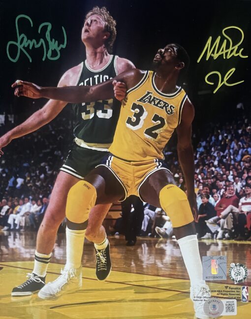This is a Los Angeles Lakers and Boston Celtics 8×10 photo that was personally autographed by Magic Johnson and Larry Bird. Includes a certificate of authenticity from Beckett Authentication Services (BAS) and Denver Autographs.