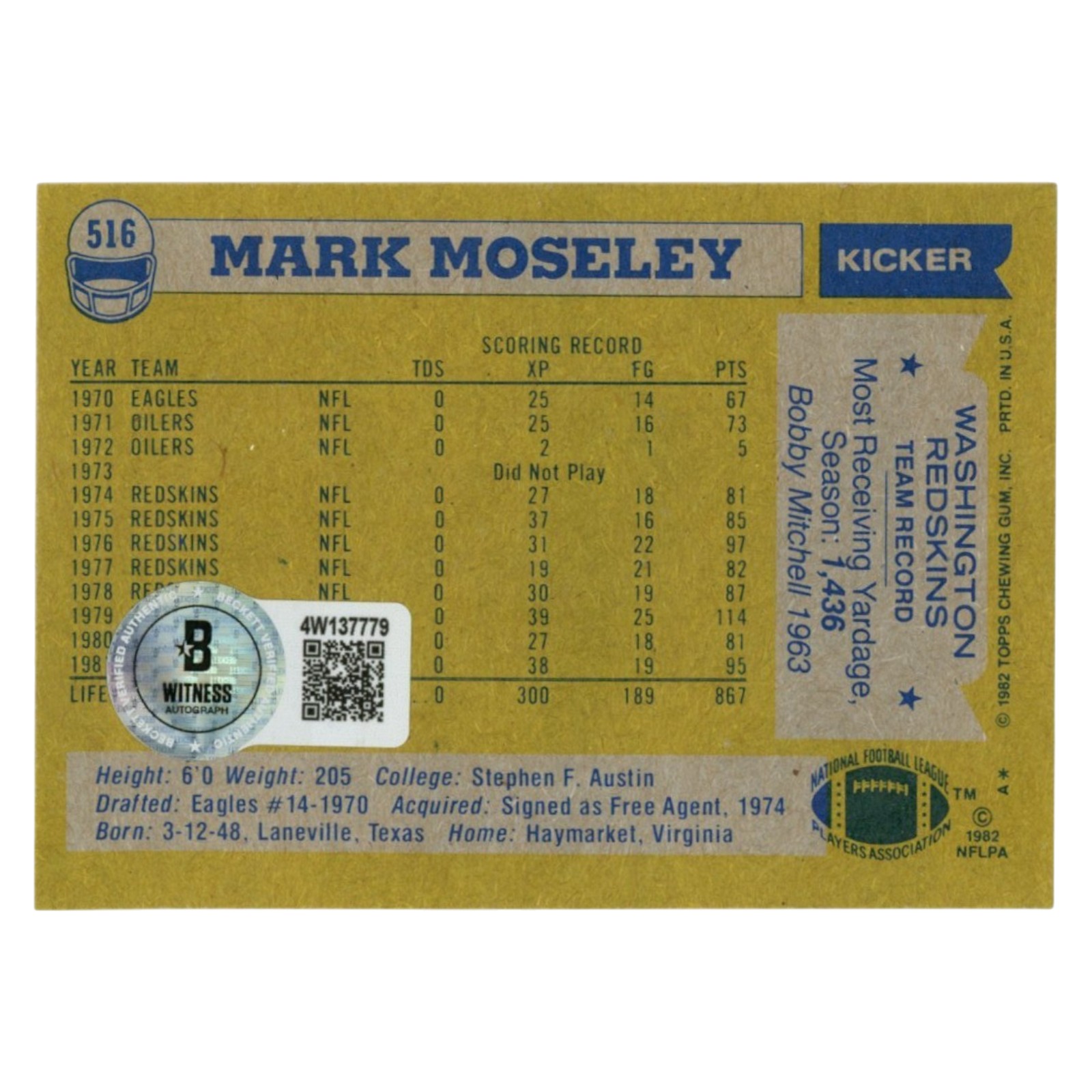 Mark Moseley Autographed Washington Redskins Trading Card Beckett Witness 54719