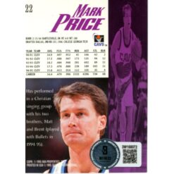 The number in the listing title is just an inventory sku for our records and is not the authentication number. The item pictured is the exact image you will receive, please see photos for condition. This is a Cleveland Cavaliers 1995-1996 Upper Deck Skybox #22 Trading Card that was personally autographed by Mark Price. Includes a certificate of authenticity from Beckett Authentication Services (BAS) and Denver Autographs. FREE SHIPPING within the USA on orders over $99!