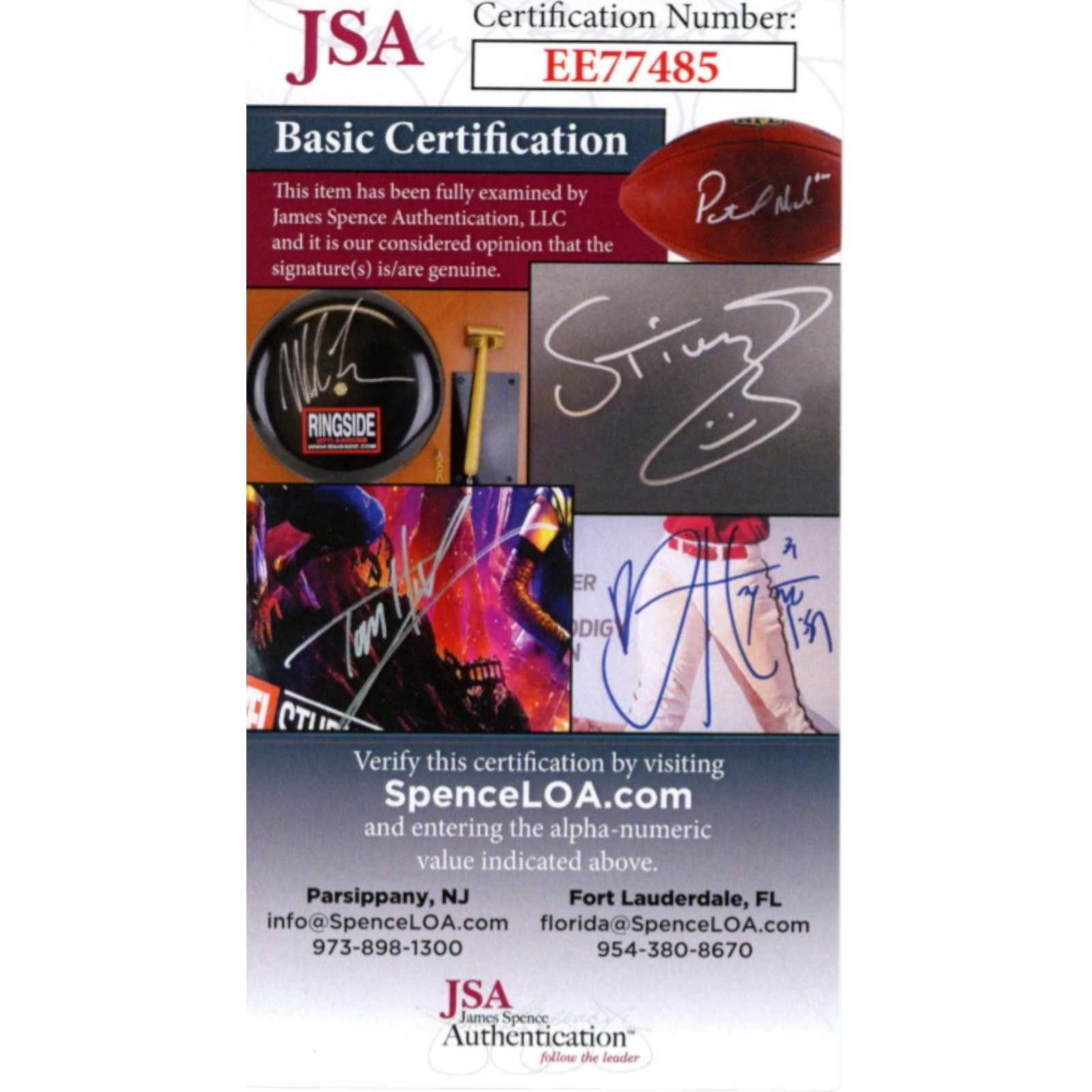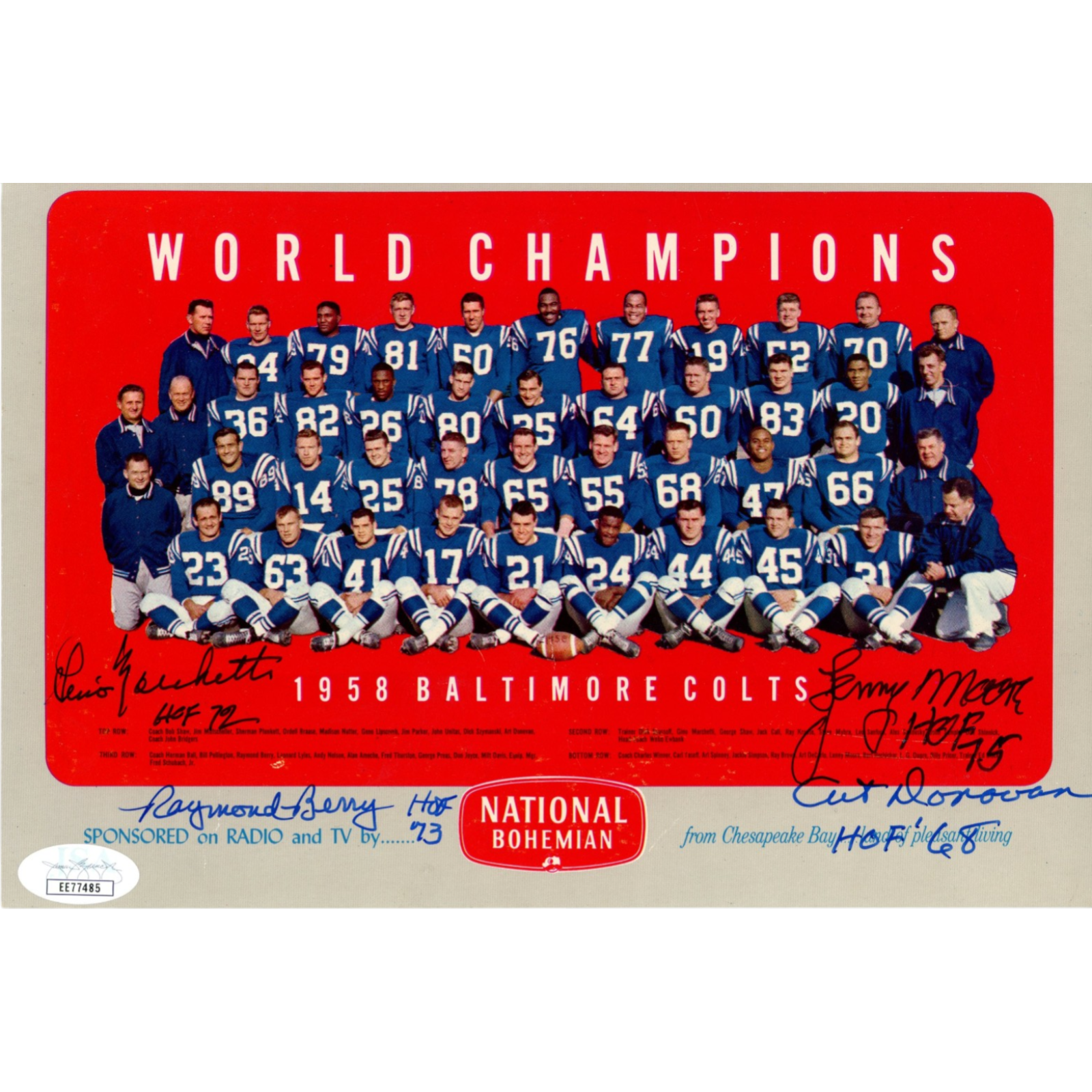 The number in the listing title is just an inventory sku for our records and is not the authentication number. The item pictured is the exact item you will receive, please see photos for condition. This is a Baltimore Colts 6×9 Photo that was personally autographed by Lenny Moore, Art Donovan, Gino Marchetti, and Raymond Berry includes “HOF” inscriptions. Includes a certificate of authenticity / hologram from James Spence Authentication (JSA) and Denver Autographs. FREE SHIPPING within the USA on orders over $99!