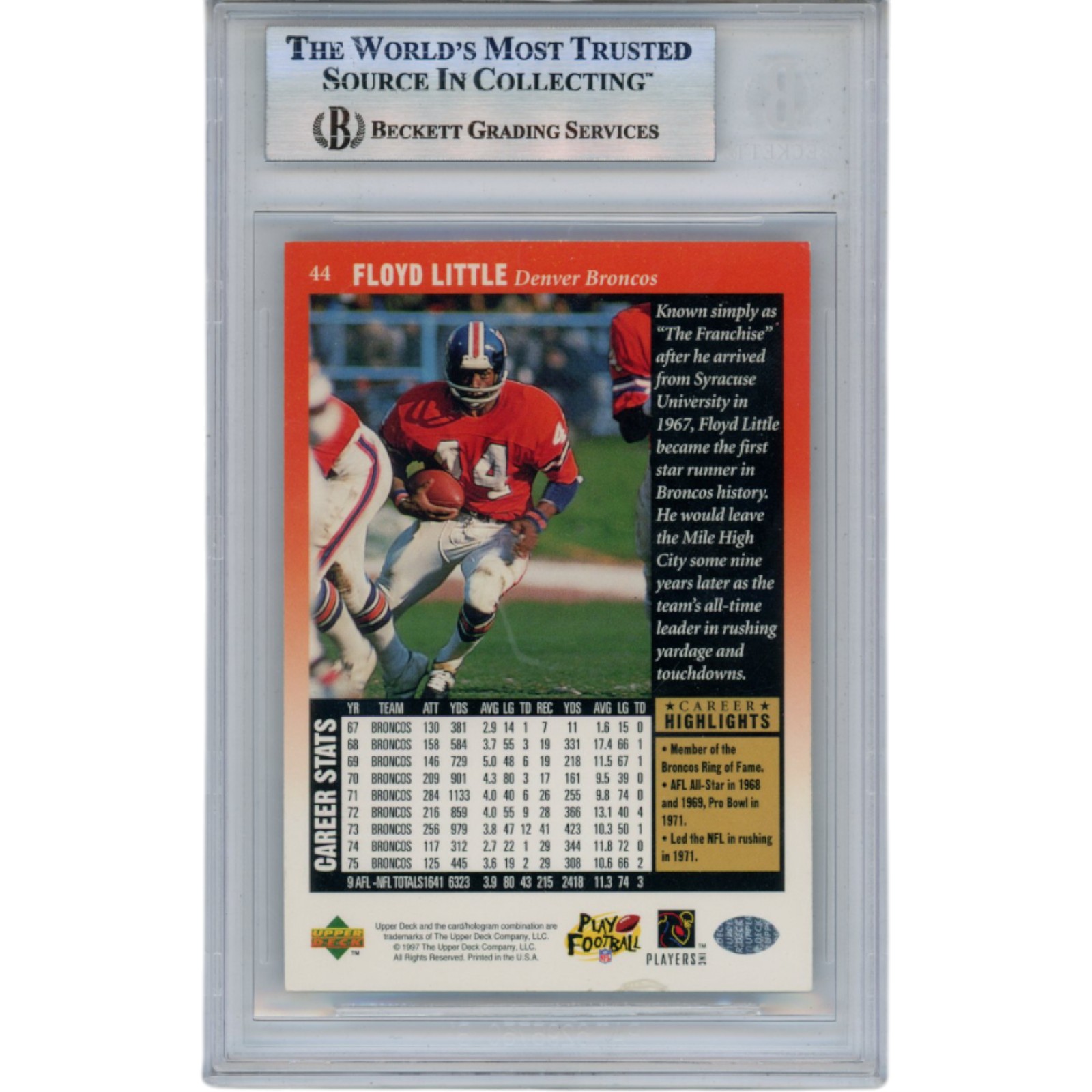 Floyd Little Signed 1997 Upper Deck Legends #44 Trading Card Slab Beckett 51545