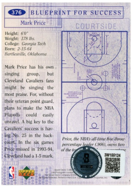 The number in the listing title is just an inventory sku for our records and is not the authentication number. The item pictured is the exact image you will receive, please see photos for condition. This is a Cleveland Cavaliers 1994-1995 Upper Deck #376 Trading Card that was personally autographed by Mark Price. Includes a certificate of authenticity from Beckett Authentication Services (BAS) and Denver Autographs. FREE SHIPPING within the USA on orders over $10!