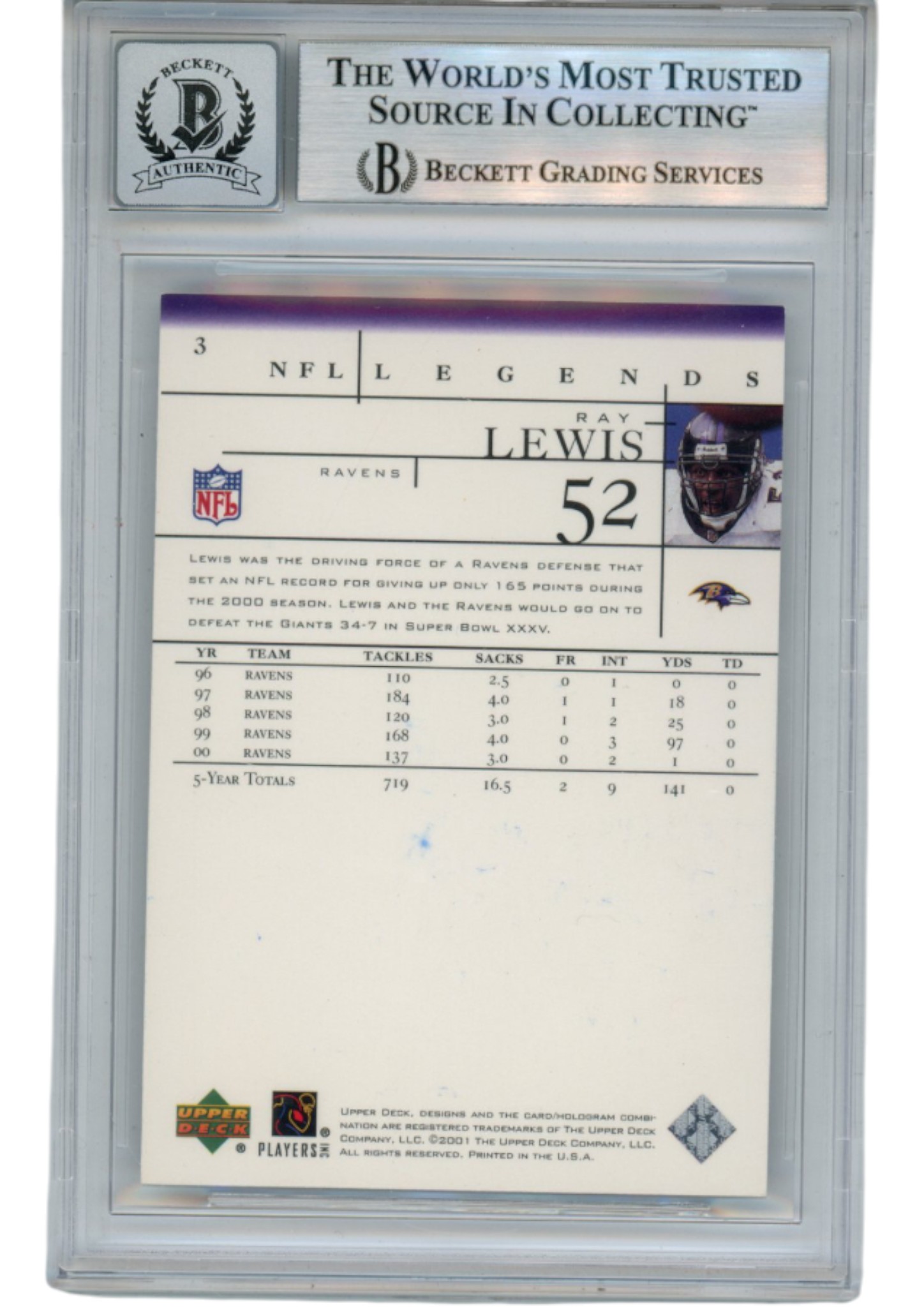 Ray Lewis Autographed 2001 Upper Deck Legends #3 Trading Card Beckett 53039