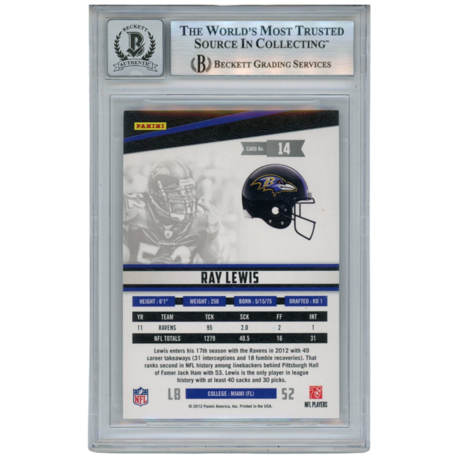 Ray Lewis Autographed 2012 Panini Rookies & Stars #14 Trading Card Beckett 52920