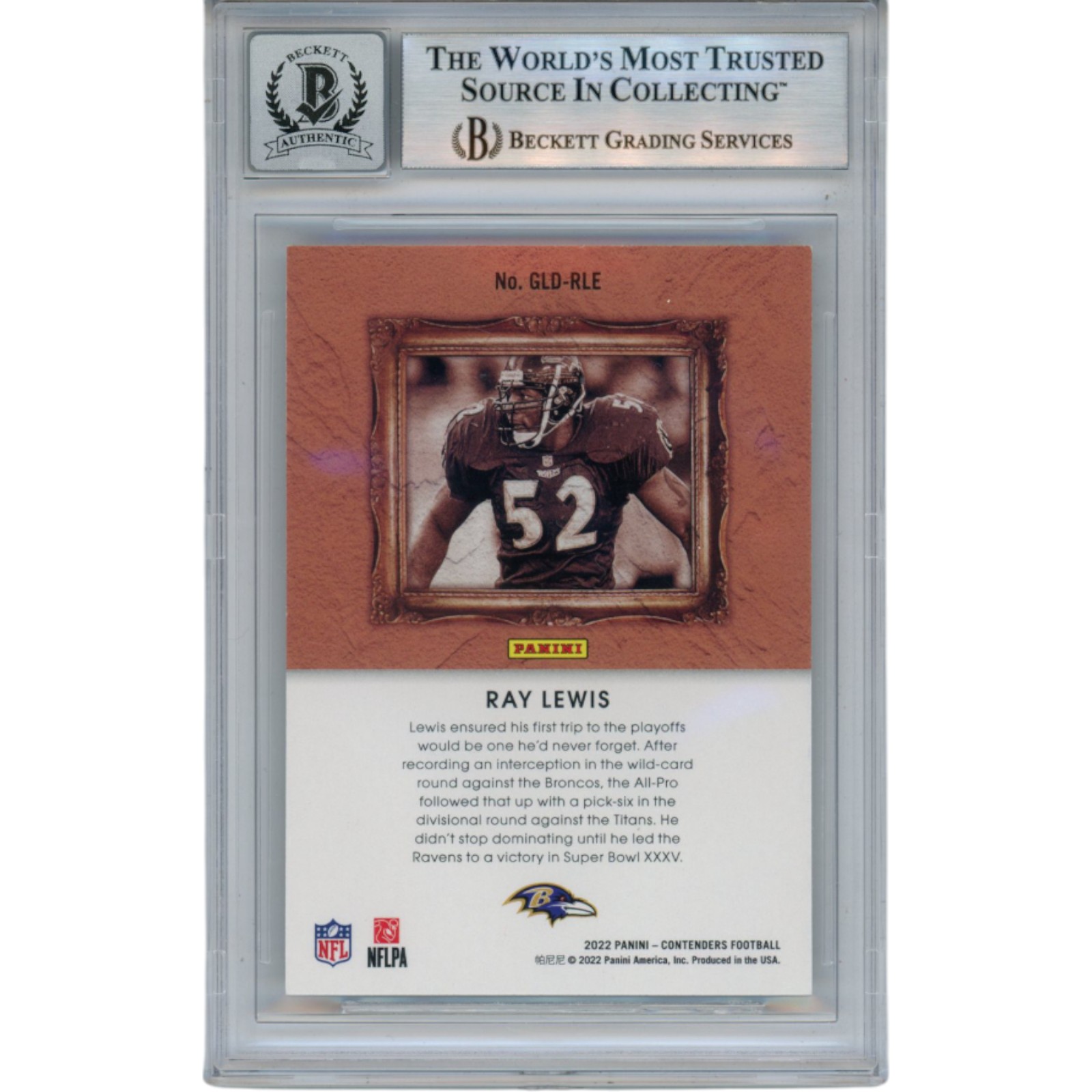 The number in the listing title is just an inventory sku for our records and is not the authentication number. The item pictured is a stock photo. There are multiple quantities of this item. Each of these items is unique because they are individually hand-signed. While the photographs accurately represent the item itself, please note that the signature’s size, exact placement, and strength may differ on the one you receive. This is a Baltimore Ravens 2022 Panini Gladiators #GLD-RLE Slabbed Trading Card that was personally autographed by Ray Lewis. Includes a certificate of authenticity / hologram from Beckett Authentication Services (BAS) and Denver Autographs. FREE SHIPPING within the USA on orders over $99!
