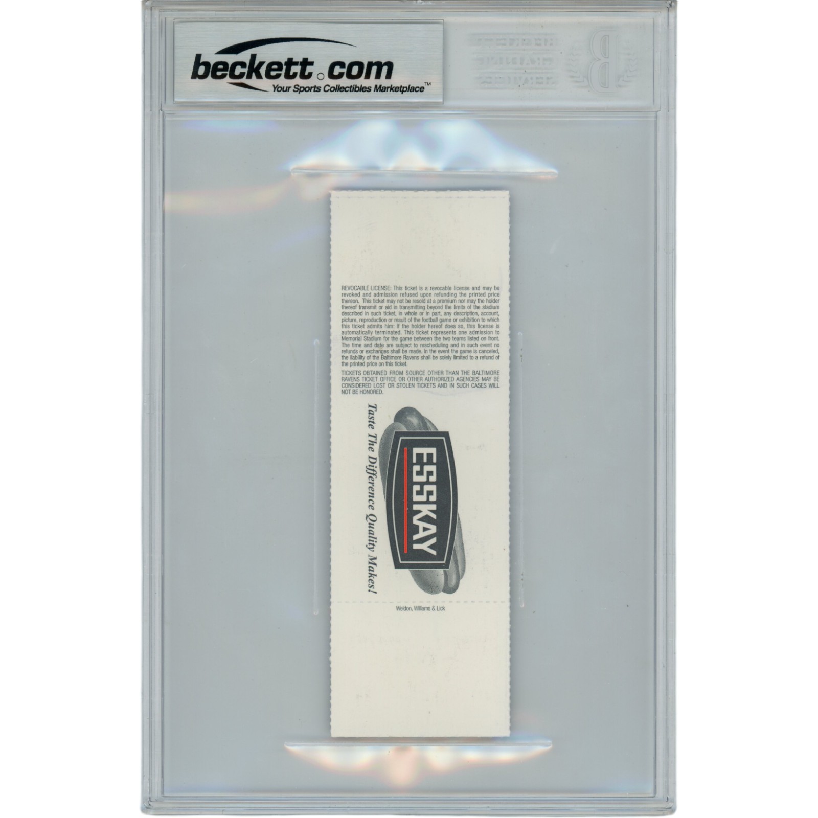 This is a Baltimore Ravens Slabbed 12/01/96 Full Ticket Stub that was personally autographed by Ray Lewis. Includes a certificate of authenticity from Beckett Authentication Services (BAS) and Denver Autographs.